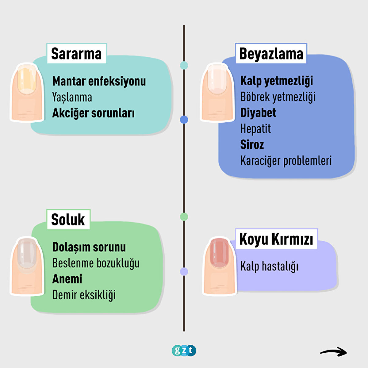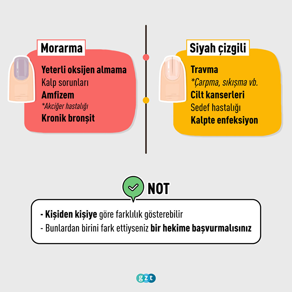 Tırnak şekli veya rengi size hastalığınızın ne olduğunu söylüyor. Ancak bunlar sadece sağlığınıza dair ipucu. Kişiden kişiye farklılık gösterebilir. Siz yine de tırnağınızda bu değişimlerden birini fark ederseniz bir doktora başvurmanızı öneririz.