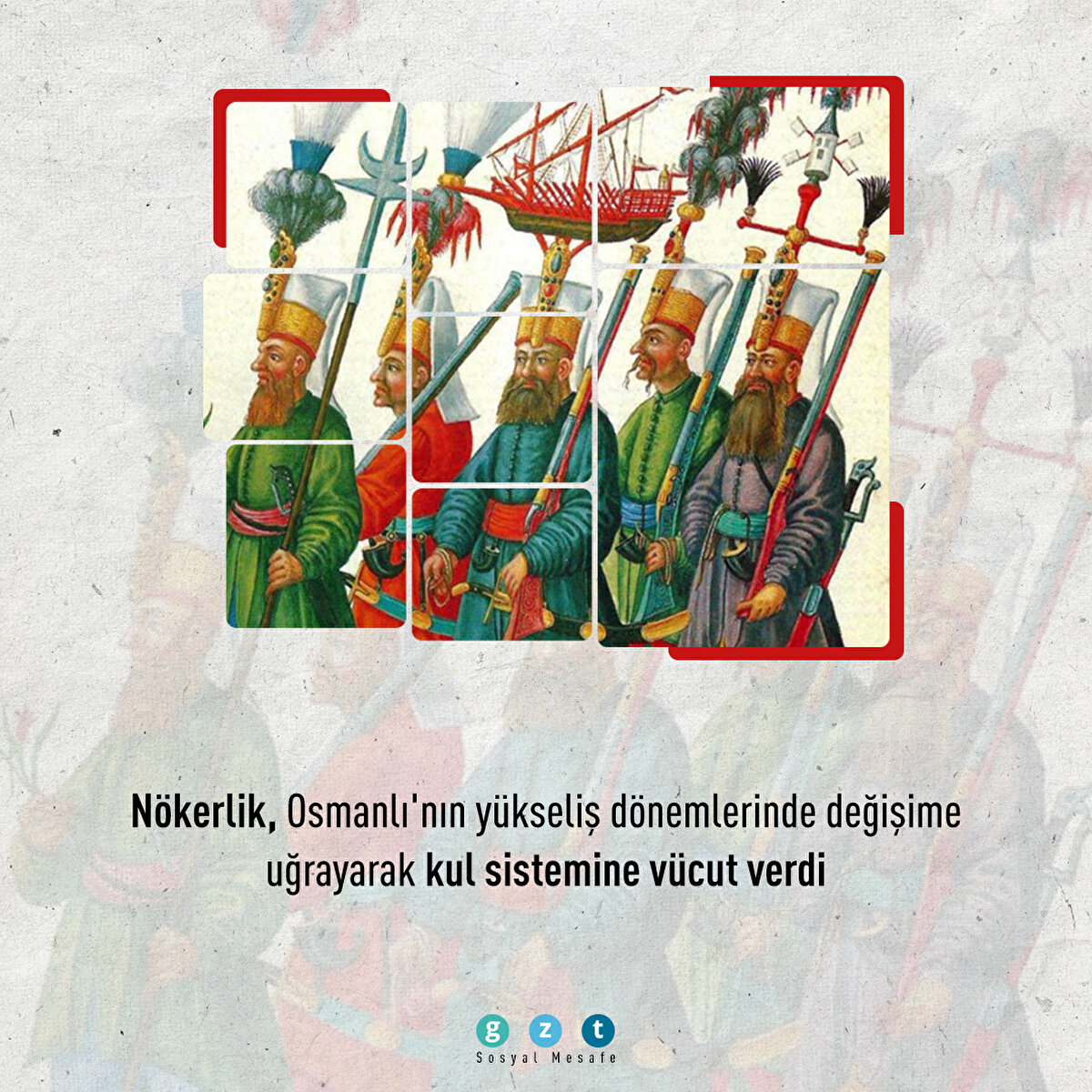Türk-Moğol tarihinde özellikle 13. yüzyıldan itibaren görünür hale gelen nökerlik, Osmanlı'nın kuruluş yıllarında da egemen bir kurumdu. Nöker, 'yoldaş, hizmetkar ve arkadaş' anlamlarına geliyordu. Moğollar için nöker, bağışlanmış kişi demekti. Savaşta esir düşüp yeteneği ile hükümdarın takdirini kazanan, canı bağışlanan ve orduya alınan hizmetkarlara nöker adı verilirdi. Cengiz Han'ın en güvendiği komutanı Kurt Cebe ve Bizans tekfuruyken esir düşüp Osman Gazi'nin silah arkadaşı olan Köse Mihal, nökerlik kurumuna en iyi örneklerdi. Nökerler, Osmanlı'nın kuruluş yıllarında gaza/cihat politikalarının başarıya ulaşmasında ve Balkan fetihlerinin hızlanmasında büyük rol oynadılar.