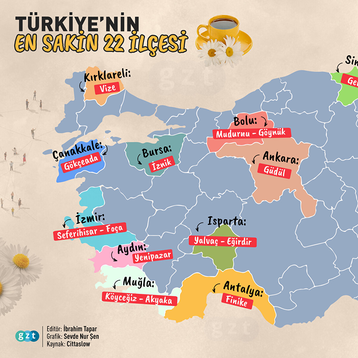 Dünyada 30 ülkede 278 kente yayılan bir model olan Uluslararası Cittaslow Birliği'nin 'sakin şehir' listesinde, Türkiye'den 22 ilçe bulunuyor. Cittaslow aday listesinde 8 ilçenin de adaylık süreci devam ediyor.