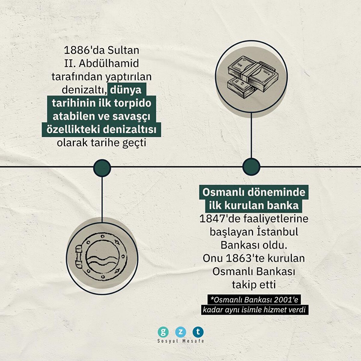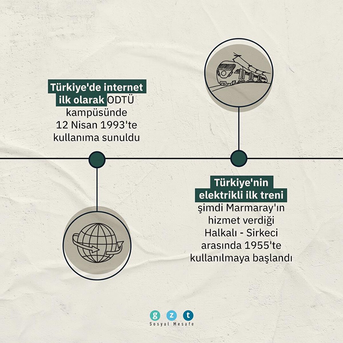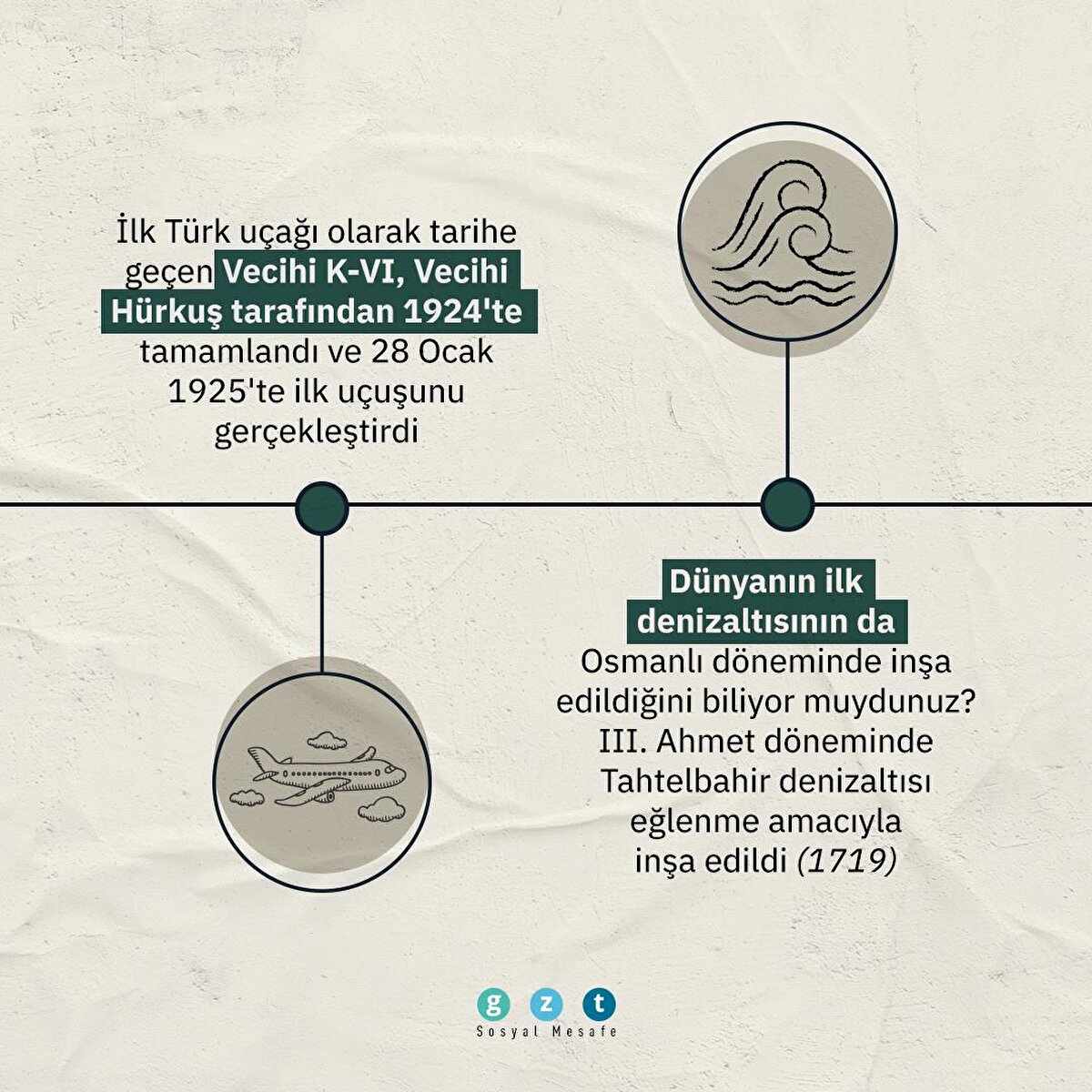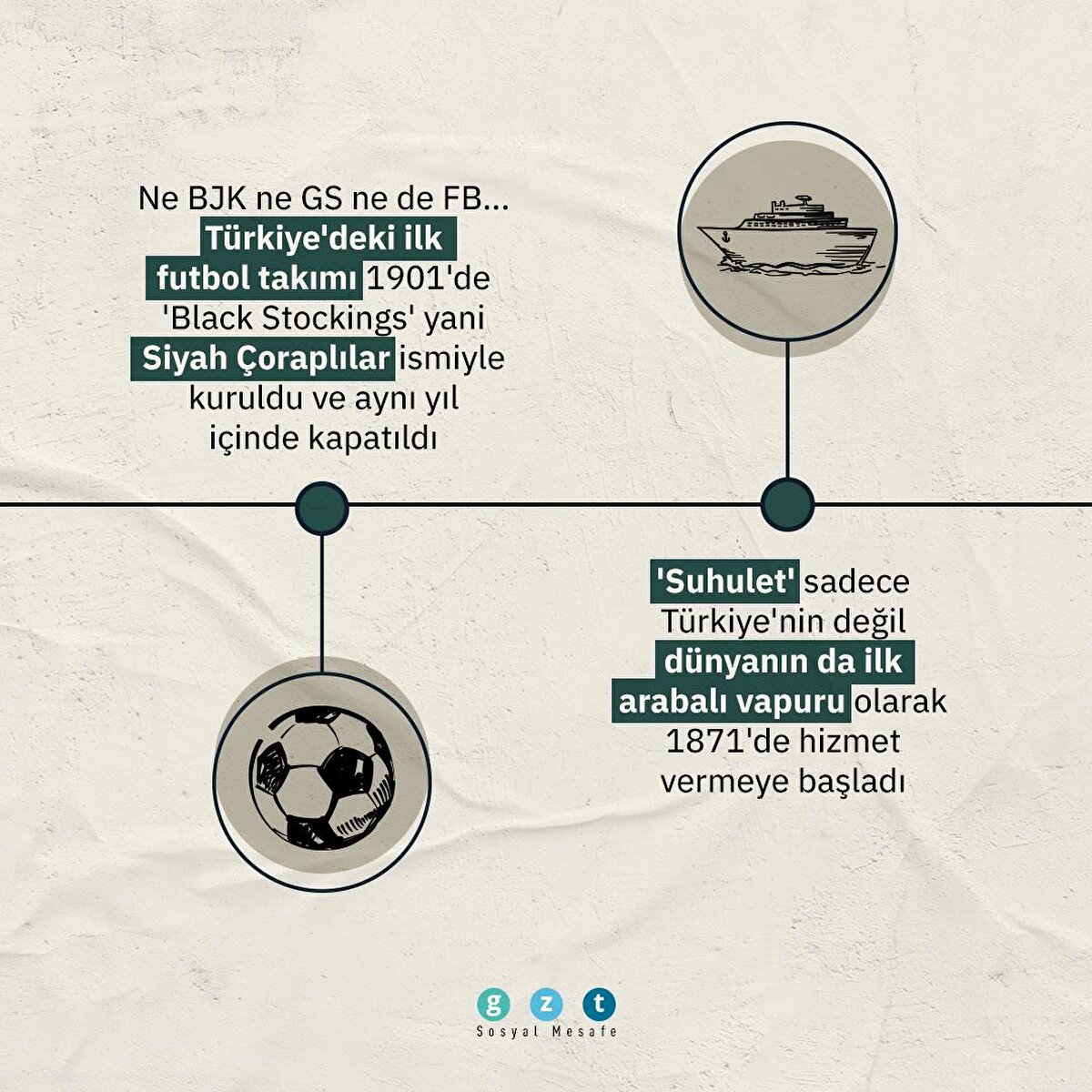1- 'Suhulet' sadece Türkiye'nin değil dünyanın da ilk arabalı vapuru olarak 1871'de hizmet vermeye başladı 2- Ne BJK ne GS ne de FB... Türkiye'deki ilk futbol takımı 1901'de 'Black Stockings' yani Siyah Çoraplılar ismiyle kuruldu ve aynı yıl içinde kapatıldı 3- İlk Türk uçağı olarak tarihe geçen Vecihi K-VI, Vecihi Hürkuş tarafından 1924'te tamamlandı ve 28 Ocak 1925'te ilk uçuşunu gerçekleştirdi 4- Dünyanın ilk denizaltısının da Osmanlı döneminde inşa edildiğini biliyor muydunuz? III. Ahmet döneminde Tahtelbahir denizaltısı eğlenme amacıyla inşa edildi (1719) 5- 1886'da suya indirilen ve Sultan II. Abdülhamid tarafından yaptırılan denizaltı, dünya tarihinin ilk torpido atabilen ve savaşçı özellikteki denizaltısı olarak tarihe geçti 6- Osmanlı döneminde ilk kurulan banka 1847'de faaliyetlerine başlayan İstanbul Bankası oldu. Onu 1863'te kurulan Osmanlı Bankası takip etti 7- Türkiye'de internet ilk olarak ODTÜ kampüsünde 12 Nisan 1993'te kullanıma sunuldu 8- Türkiye'nin elektrikli ilk treni şimdi Marmaray'ın hizmet verdiği Halkalı - Sirkeci arasında 1955'te kullanılmaya başlandı