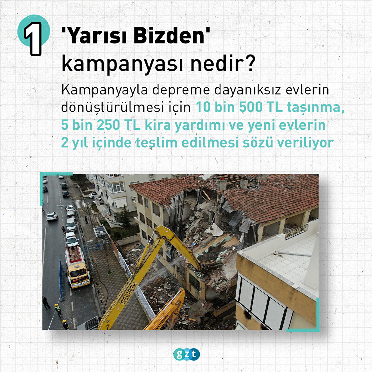 Çevre, Şehircilik ve İklim Değişikliği Bakanlığı kentsel dönüşüme yönelik “Dönüşümde Yarısı Bizden” kampanyası devam ediyor. Kentsel Dönüşüm Yarısı Bizden kampanyası başvurusu 29 Mayıs tarihine kadar e-devlet üzerinden yapılabilecek. Yapının yıkılmasından sonra, malikin başvurusuna müteakip 5 bin 250 lira kira, 10 bin 500 lira taşınma yardımı yapılacak.