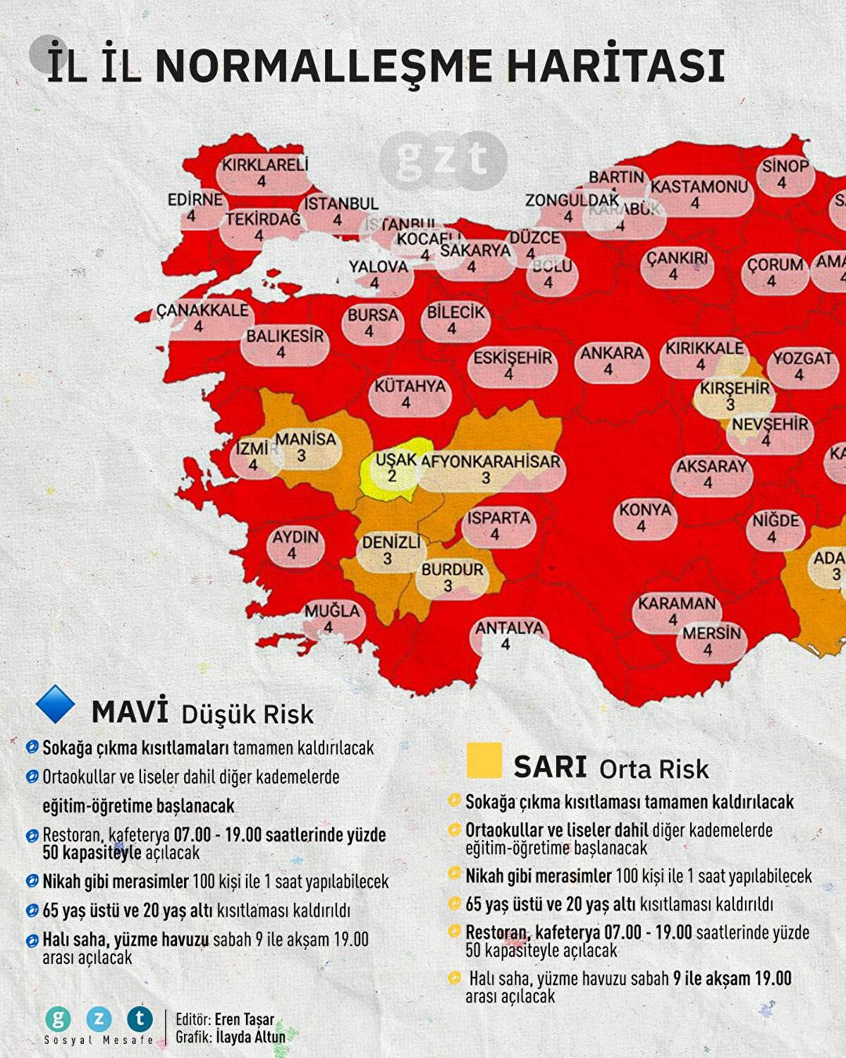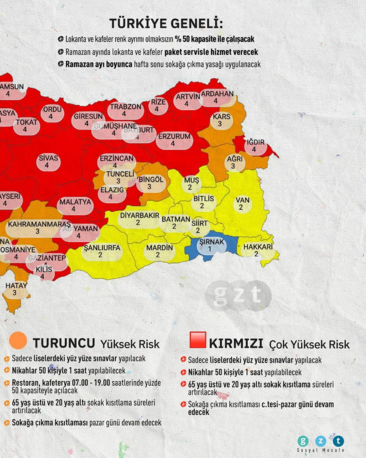 Kabine toplantısının ardından açıklamalarda bulunan Cumhurbaşkanı Erdoğan, Türkiye'nin yeni risk haritası paylaştı. Haritaya göre; Türkiye'de tek mavi il Şırnak kaldı. 1 Mart'tan bu yana 41 il daha kırmızı kategoriye girdi. Bu kapsamda Türkiye'de 58 ilde cumartesi kısıtlaması geri geldi.