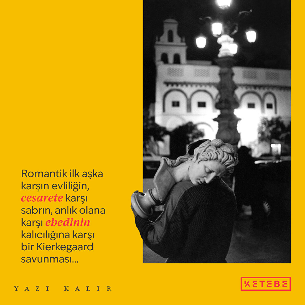 Romantik ilk aşka karşın evliliğin, cesarete karşı sabrın, anlık olana karşı ebedinin, tensele karşı ruhsalın, uçarılığa karşı tekdüzeliğin, fethetmeye karşı sahip olmanın, gurura karşı tevazuun, açgözlülüğe karşı rızanın, dışsala karşı içselin, zirve anını değil sürekli oluşun övüldüğü bu eser Ya/Ya da'nın birinci kısmına bir yanıt niteliğinde.