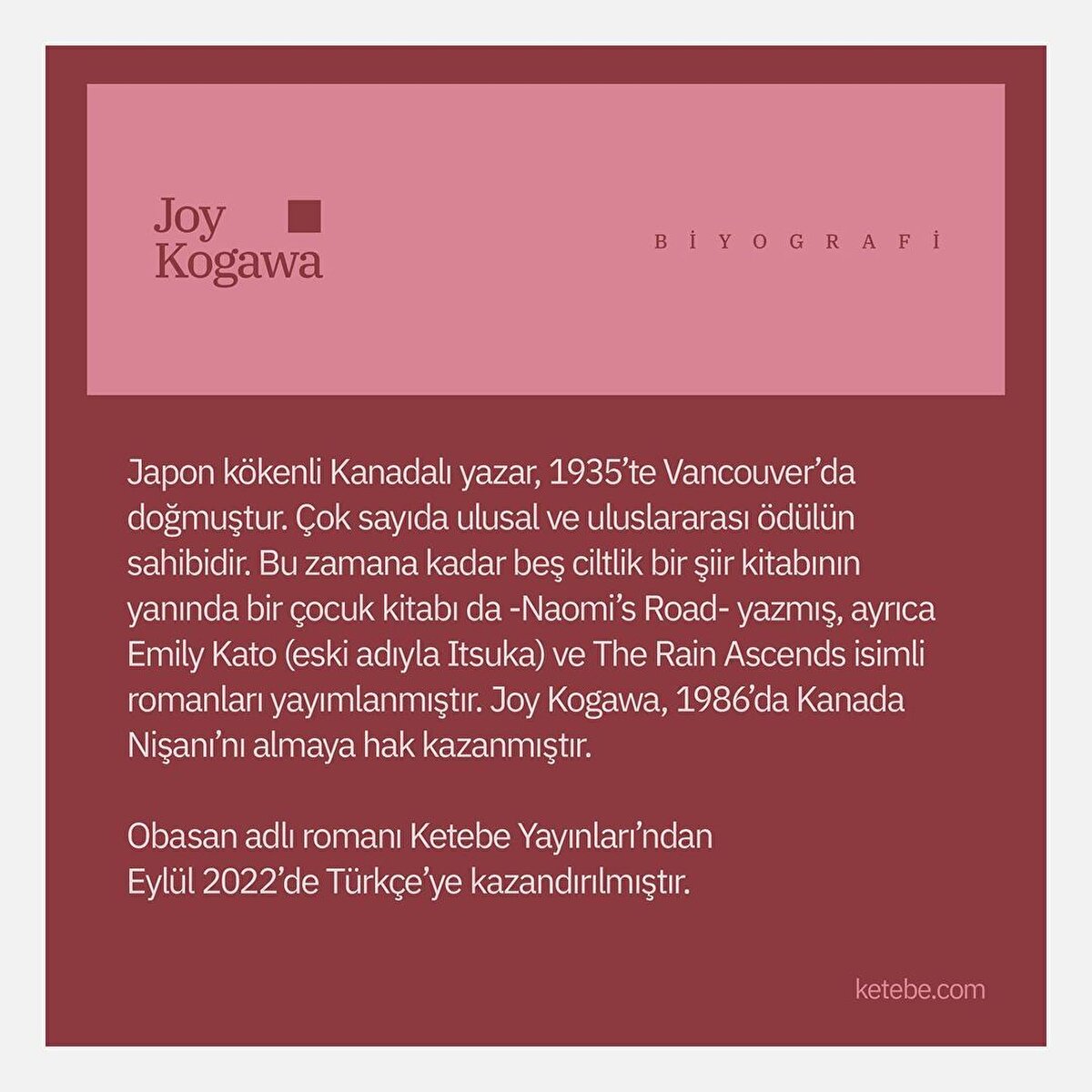 Güçlü ve tutkulu bir hikâyeye sahip ödüllü roman Obasan, II. Dünya Savaşı sırasında Japon asıllı Kanadalıların yaşadığı dokunaklı olayları bir çocuğun gözünden anlatıyor. Naomi, Pearl Harbor Saldırısı onun hayatını değiştirdiğinde korunaklı dünyasında sevgiyle büyütülen beş yaşında bir çocuktu. Annesinin kaybının ardından kendisinin ve ailesinin nasıl da “düşman uzaylılar" haline geldiğini, yaşadığı topraklarda ırkçı saldırılara uğradığını, hayalet kasabaya sürgüne zorlandığını, hor görüldüğünü ve parçalandığını şaşkınlıkla izledi. Hayatı akıl almaz zorluklarla ve acıyla sarılan Naomi için amcasının eşi Obasan'ın kararlılığı, dayanıklılığı ve çevresindekilerin sessizliği onu koruyan bir zırhtı. Ancak Naomi büyüdüğünde, kaderlerine musallat olan bu ürkütücü sessizlik perdesini aralamaya karar verdi. Kamplarda tutulan binlerce insandan biri olan yazar Joy Kogawa'nın kaleminden Obasan, günümüze dair rahatsız edici benzerlikler barındıran satırlarıyla, II. Dünya Savaşı'nın dramatik sonuçlarını Kanada'daki bir Japon göçmen ailesi üzerinden okuyabileceğiniz yürek burkan bir anlatı.
