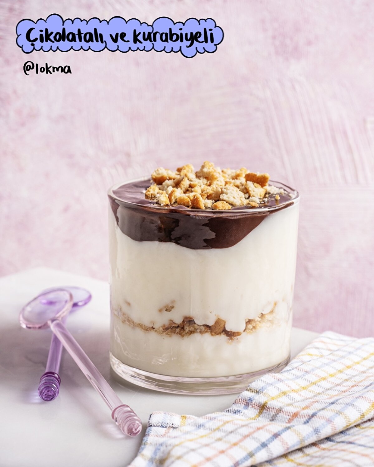 -En son servis edeceğiniz kaseye sırasıyla muhallebi, kurabiye ve çikolata sosunu ekleyin.