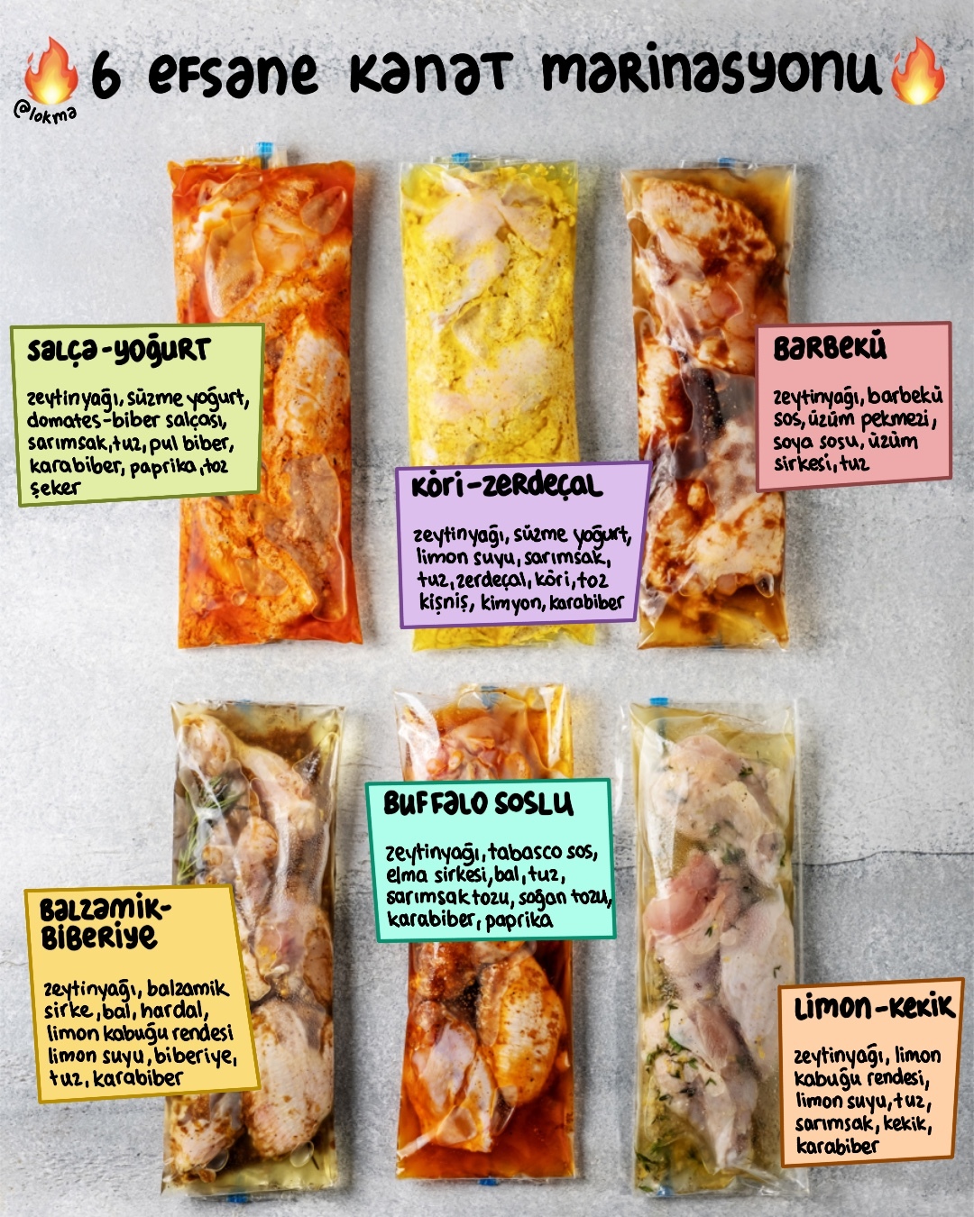 Kanat Marinasyonları 🥫Salçalı yoğurtlu 200 gram tavuk kanat 2 yemek kaşığı zeytinyağı 2 yemek kaşığı süzme yoğurt 1 tatlı kaşığı domates salçası 1 tatlı kaşığı biber salçası 1 diş ezilmiş sarımsak 1/2 çay kaşığı tuz 1/2 çay kaşığı pul biber 1/2 çay kaşığı karabiber 1 çay kaşığı toz kırmızı biber 1 tatlı kaşığı toz şeker