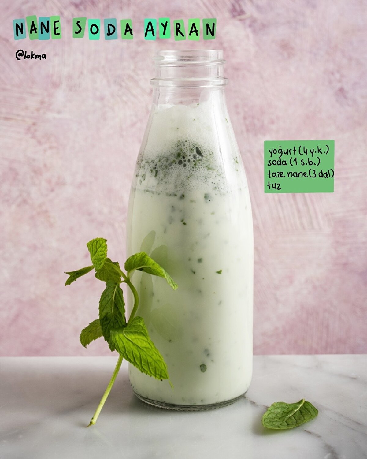 🌱Naneli Sodalı Ayran 4 yemek kaşığı yoğurt 1 Su bardağı soda 3 dal taze nane Tuz