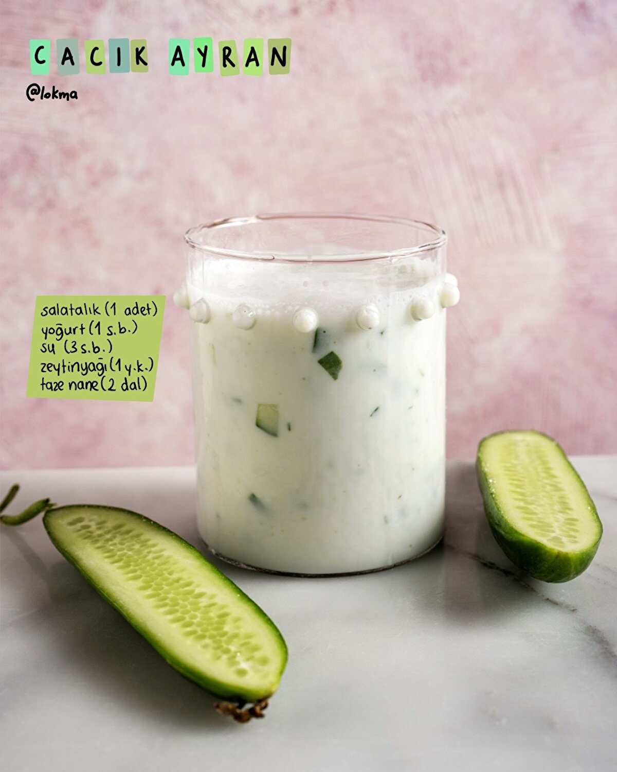 🥒Cacık Ayran 1 salatalık 1 Su bardağı yoğurt 3 Su bardağı su 1 çay kaşığı zeytinyağı 2 dal taze nane