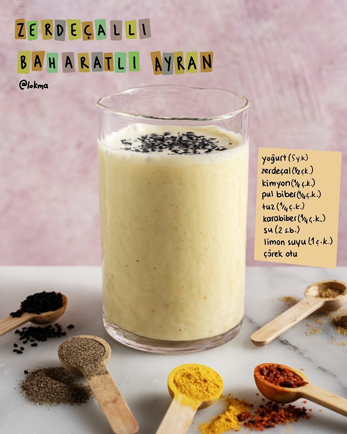 🫚Zerdeçallı Baharatlı Ayran 5 yk yoğurt 2 Sb su 1/2 çk zerdeçal 1/4 çk kimyon 1/4 çk pul biber 1/4 çk tuz 1/4 çk karabiber 1 çk limon suyu Üzeri için; Çörek otu