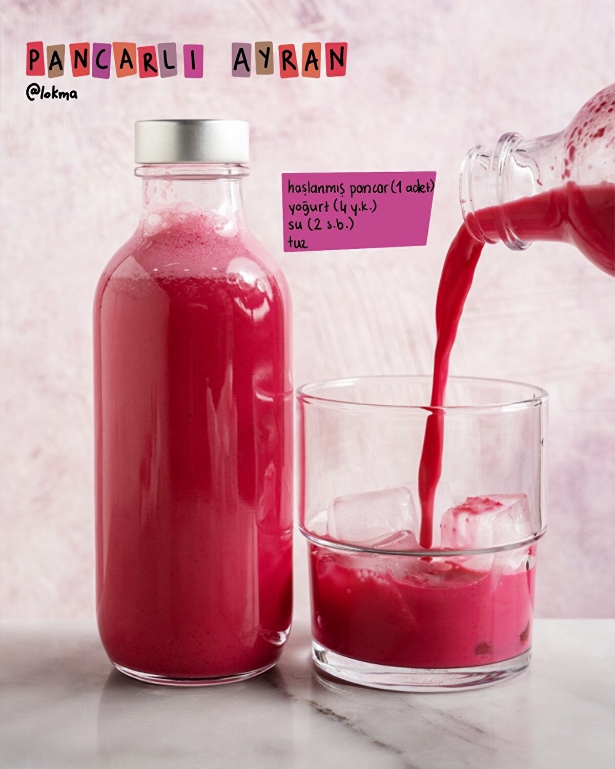 🧂Pancarlı Ayran 1 haşlanmış pancar 4 yemek kaşığı yoğurt 2 su bardağı su Tuz