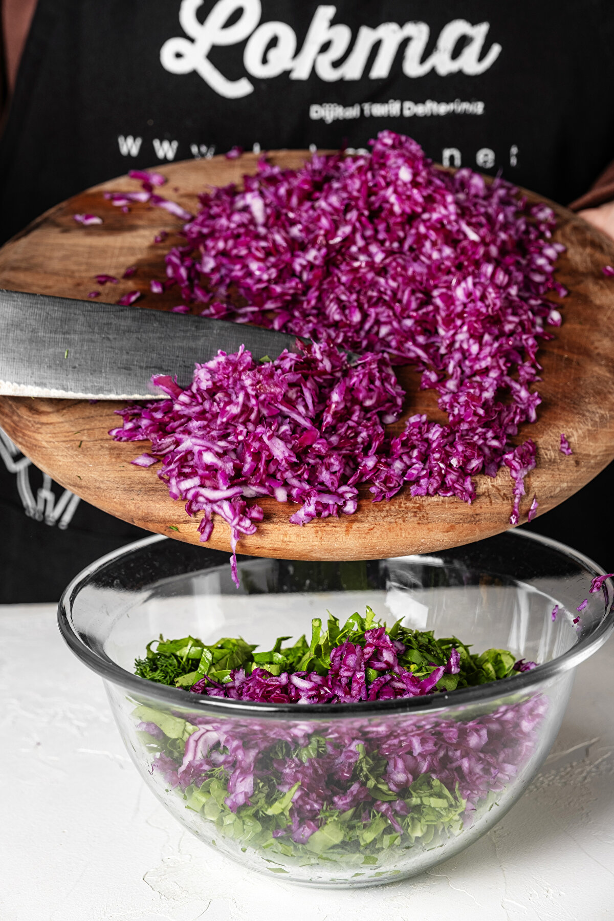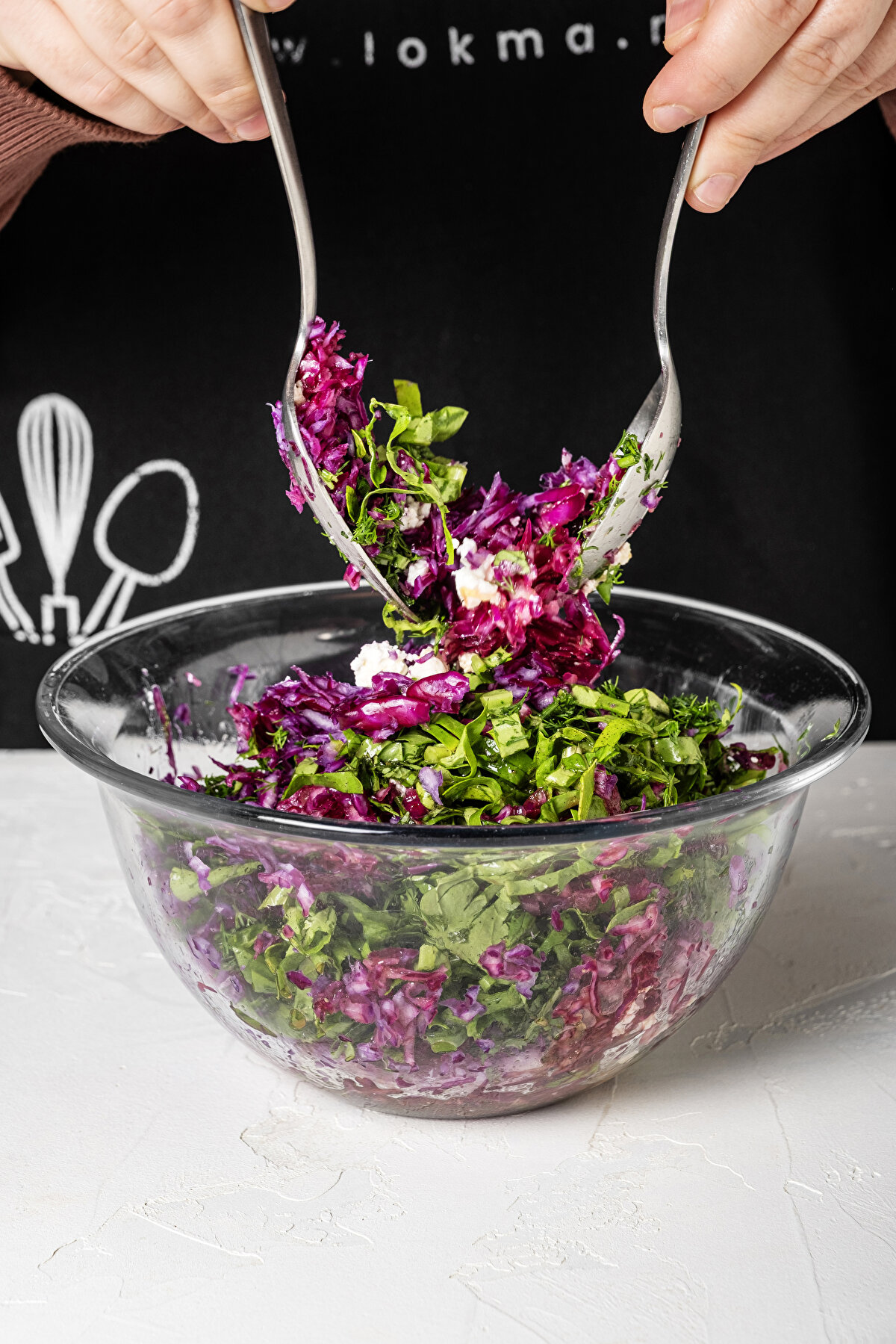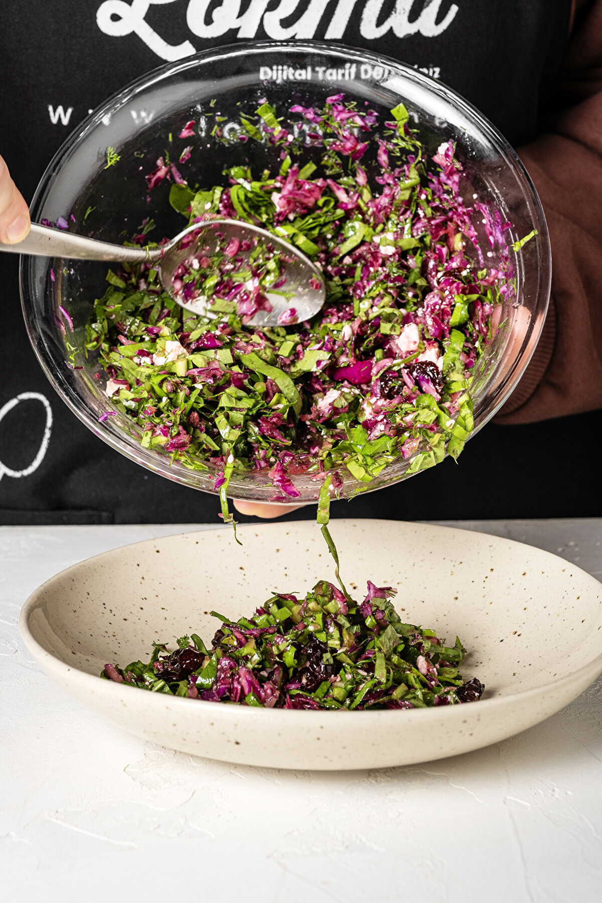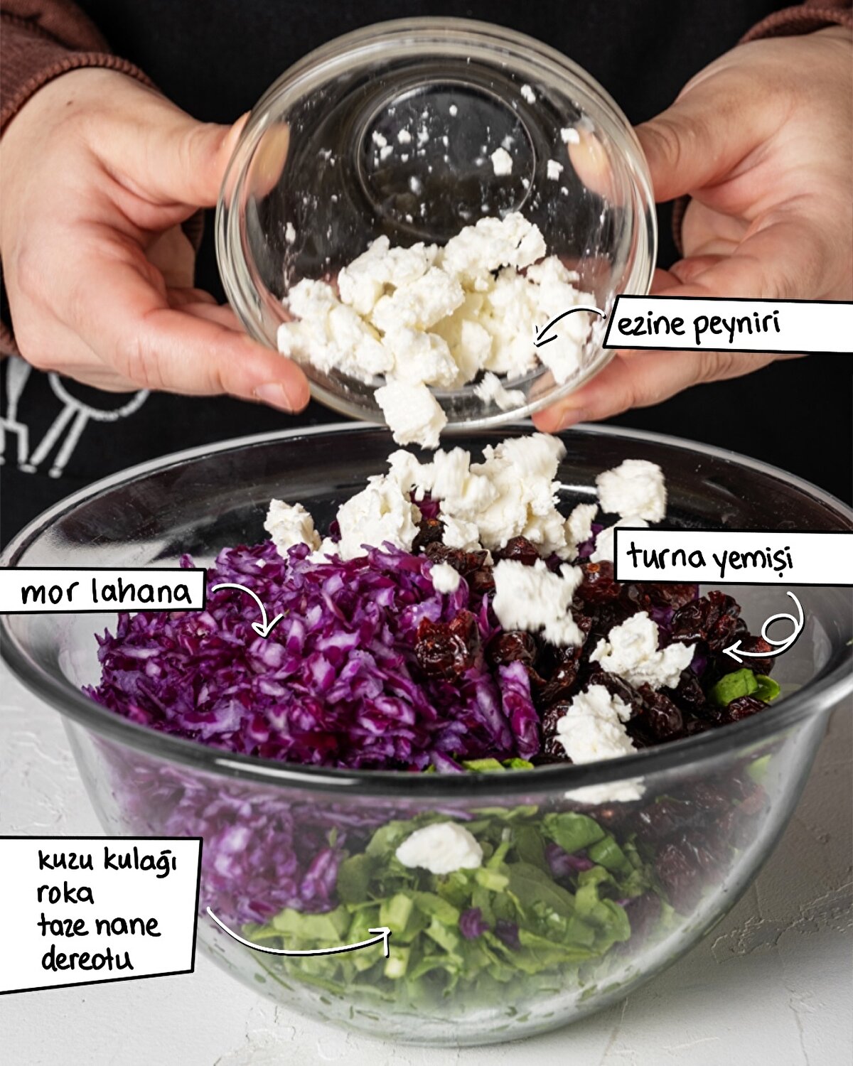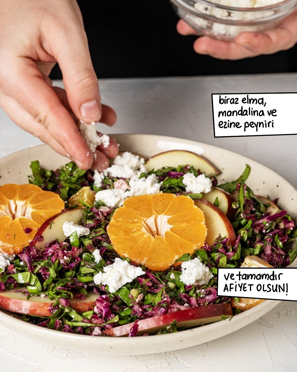 Mandalinalı Kış Salatası 🍊Malzemeler 1/3 rendelenmiş mor lahana 5 dal ince kıyılmış kuzu kulağı 5 dal ince kıyılmış roka 8-10 yaprak ince kıyılmış nane 1/2 demet ince kıyılmış dereotu 1 avuç ufalanmış ezine peyniri 1 avuç turna yemişi