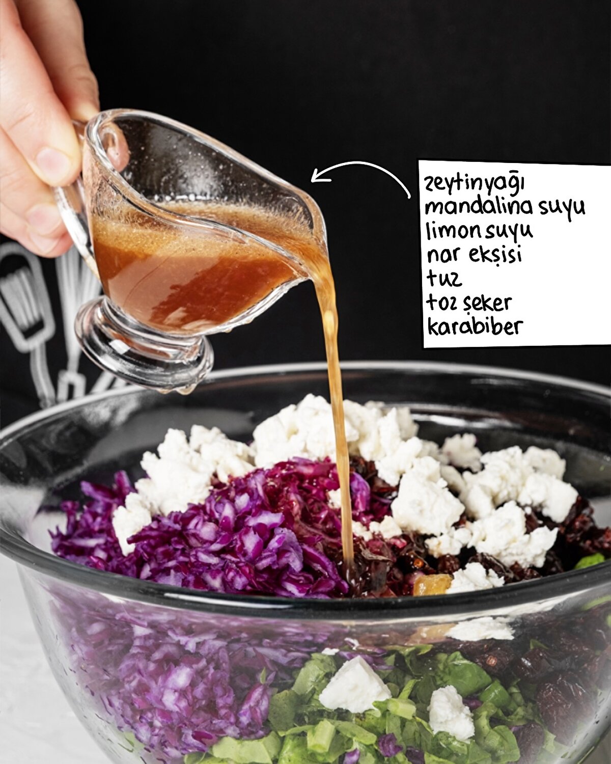 🥗Sosu için 1/2 çay bardağı zeytinyağı 2 adet mandalinanın suyu 1 adet limonun suyu 1/3 çay bardağı nar ekşisi 1 çay kaşığı tuz 1 çay kaşığı toz şeker 1/3 çay kaşığı karabiber