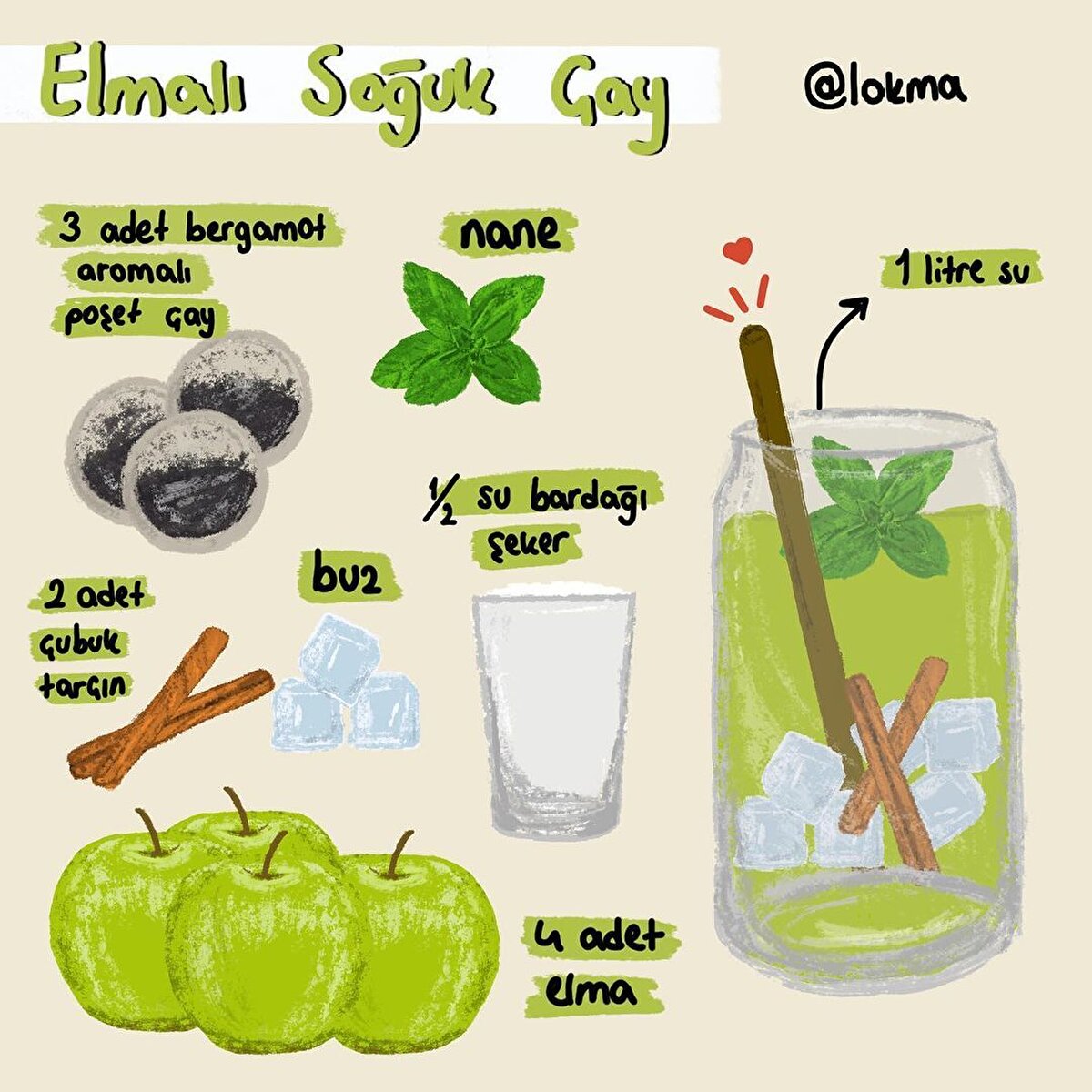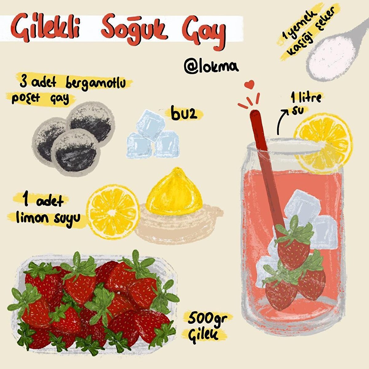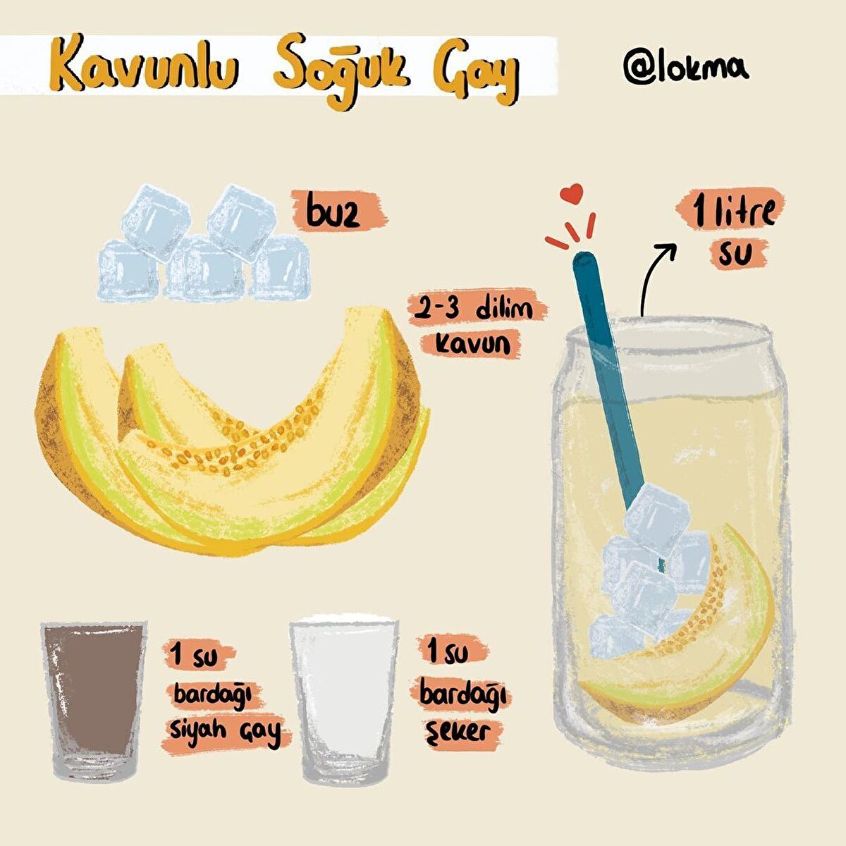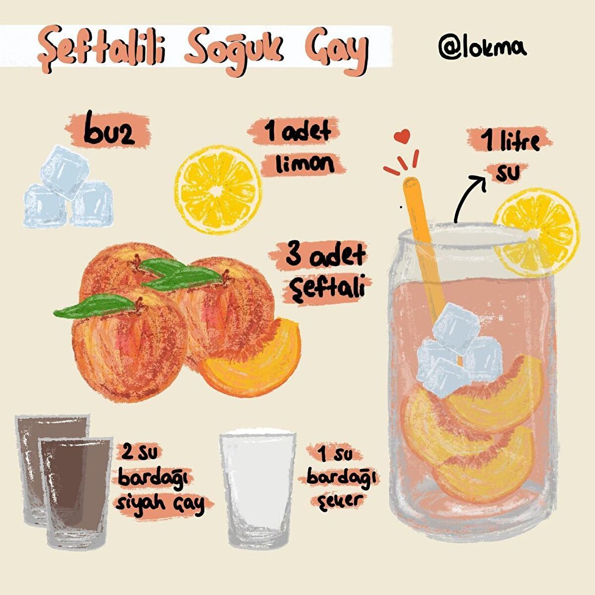 Çilekli Soğuk Çay Tarifi •Çayı demleyin ve ılıtın. •Şekeri ve limon suyunu üzerine ekleyin. •Çayı geniş ağızlı bir sürahiye alın ve çilekleri içerisine doğrayın. •Buz küplerini ilave edin ve çayınız servise hazır.Elmalı Soğuk Çay Tarifi •Çayı demleyin ve ılıtın. •İki elmayı kabuklarıyla beraber dilimleyin. •İki elmayı kabuklarıyla beraber rendeleyin ve suyunu süzün. •Elma suyunu ve şekeri demlenen çaya ilave edin ve şeker eriyene kadar karıştırın. •Elma dilimlerini ve çubuk tarçını da ilave edin. •Buz küplerini ilave edin ve çayınız servis hazır.Şeftalili Soğuk Çay Tarifi •Çayı demleyin ve ılıtın. •Şeftalileri dilimleyip, küçük bir tencereye alın. •Üzerini geçecek kadar su ilave edin ve orta ateşte 20 dakika pişirin. •Sürahiye demlenmiş çay, soğuk su ve şeftali suyunu ekleyin. •Şeker ve limon suyunu da ekleyin. •Buz küplerini ilave edin ve çayınız servise hazır.Karpuzlu Soğuk Çay Tarifi •Çayı demleyin ve ılıtın. •Üzerine esmer şeker ekleyip karıştırın. •Çayınızı sürahiye alın ve çatalla ezerek püre haline getirdiğiniz karpuz dilimlerini süzgeçten geçirerek sürahiye ekleyin. •Fesleğen yapraklarını ilave edin ve karıştırın. •Buz küplerini ilave edin ve çayınız servise hazır.Kavunlu Soğuk Çay Tarifi •Çayı demleyin ve ılıtın. •Kavunu çatalla ezin ve şekerle karıştırıp çayın üzerine ekleyin. •Buz kalıplarını ilave edin ve çayınız servise hazır.