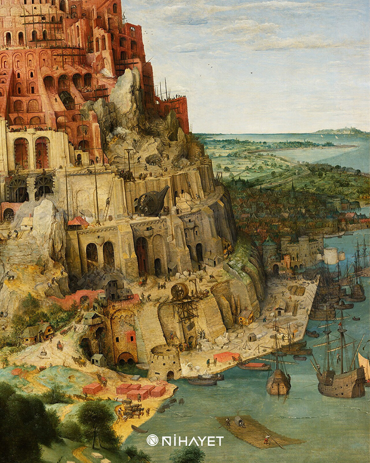 Pieter Bruegel'in bu tablosu Babil Kulesi adını taşıyor. Bruegel ömrü boyunca farklı dini hikayeleri sanatına uyarladı. Babil Kulesi'nin hikâyesi cezalandırılmış kibrin bir örneği olarak yorumlanmıştır ve Bruegel'in resmiyle anlatmak istediği de şüphesiz budur. Dahası, mühendislerin, duvar ustalarının ve işçilerin telaşlı faaliyetleri ikinci bir derse işaret eder: insan çabalarının çoğunun beyhudeliği...