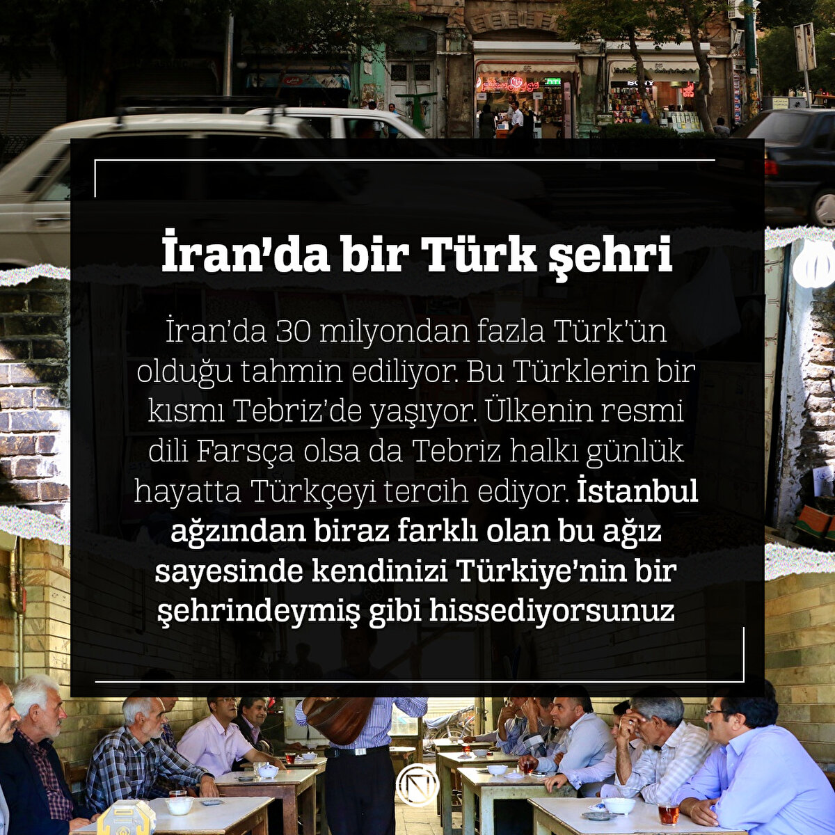 İran'da 30 milyondan fazla Türk'ün olduğu tahmin ediliyor. Bu Türklerin bir kısmı Tebriz'de yaşıyor. Ülkenin resmi dili Farsça olsa da Tebriz halkı günlük hayatta Türkçeyi tercih ediyor. İstanbul ağzından biraz farklı olan bu ağız sayesinde kendinizi Türkiye'nin bir şehrindeymiş gibi hissediyorsunuz