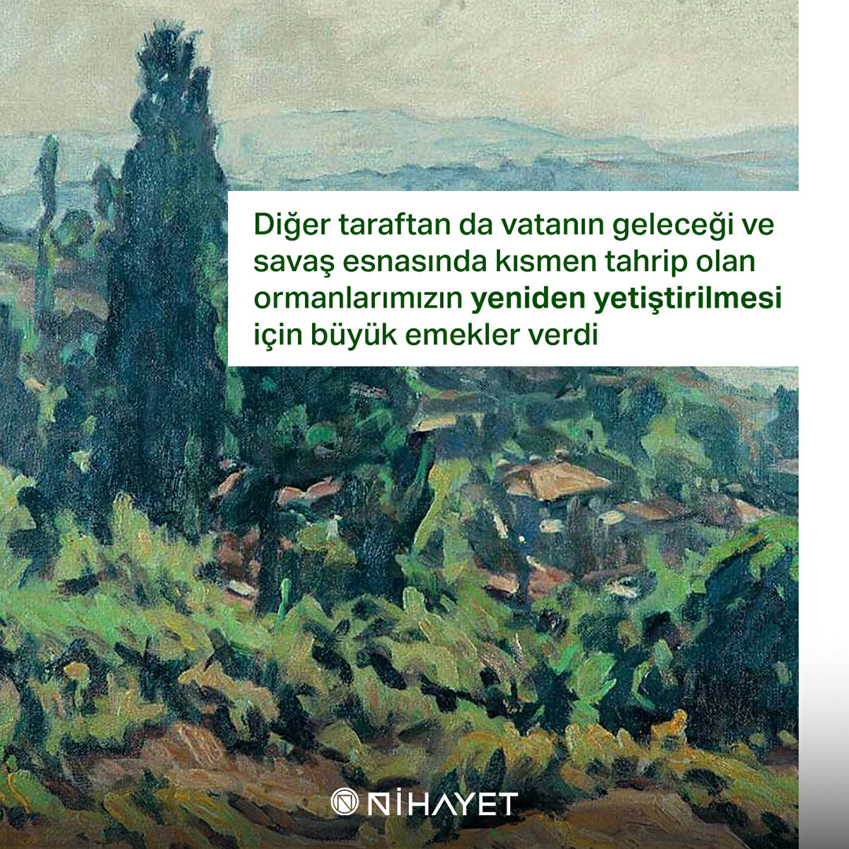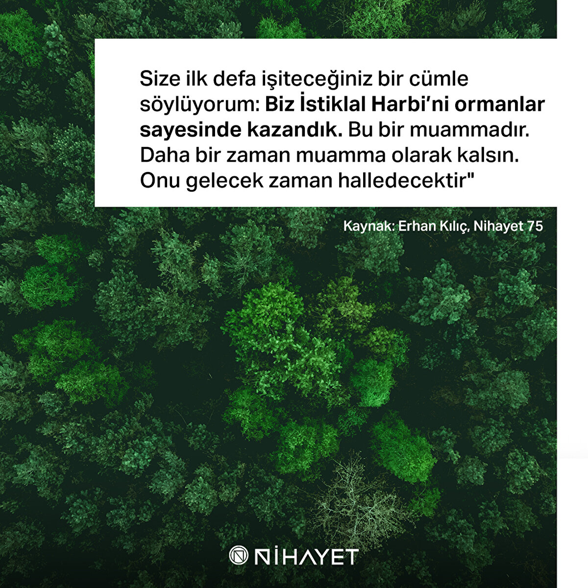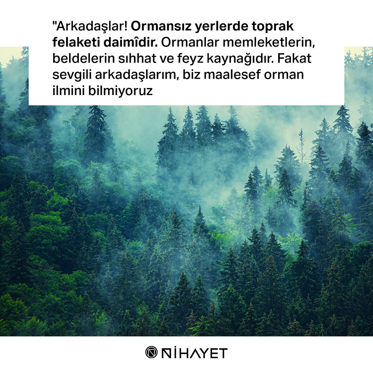 "Arkadaşlar! Ormansız yerlerde toprak felaketi daimîdir. Ormanlar memleketlerin, beldelerin sıhhat ve feyz kaynağıdır. Fakat sevgili arkadaşlarım, biz maalesef orman ilmini bilmiyoruz. Size ilk defa işiteceğiniz bir cümle söylüyorum: Biz İstiklal Harbi'ni ormanlar sayesinde kazandık. Bu bir muammadır. Daha bir zaman muamma olarak kalsın. Onu gelecek zaman halledecektir"