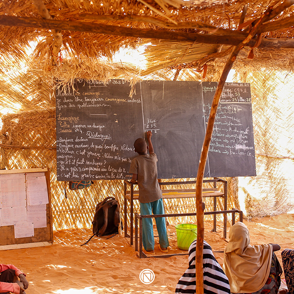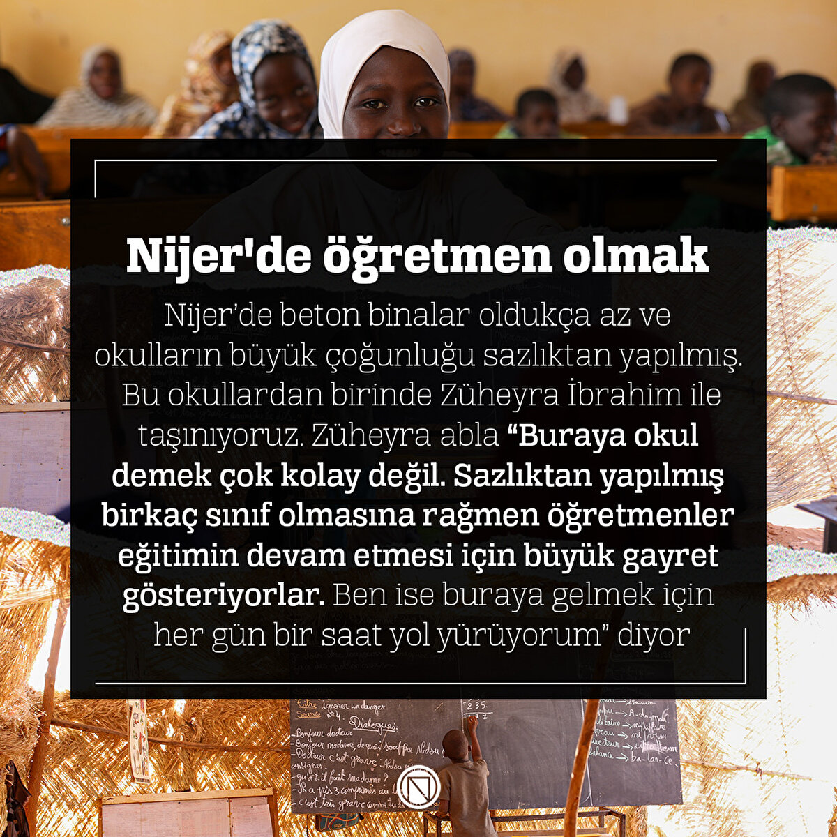 Nijer'de beton binalar oldukça az ve okulların büyük çoğunluğu sazlıktan yapılmış. Bu okullardan birinde Züheyra İbrahim ile taşınıyoruz. Züheyra abla “Buraya okul demek çok kolay değil. Sazlıktan yapılmış birkaç sınıf olmasına rağmen öğretmenler eğitimin devam etmesi için büyük gayret gösteriyorlar. Ben ise buraya gelmek için her gün bir saat yol yürüyorum” diyor