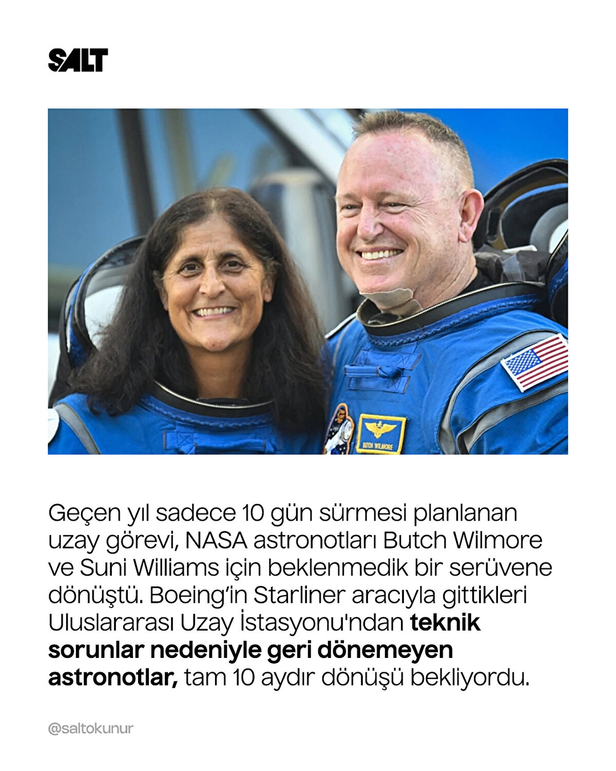 Geçen yıl sadece 10 gün sürmesi planlanan uzay görevi, NASA astronotları Butch Wilmore ve Suni Williams için beklenmedik bir serüvene dönüştü. Boeing'in Starliner aracıyla gittikleri Uluslararası Uzay İstasyonu'ndan teknik sorunlar nedeniyle geri dönemeyen astronotlar, tam 10 aydır dönüşü bekliyordu.