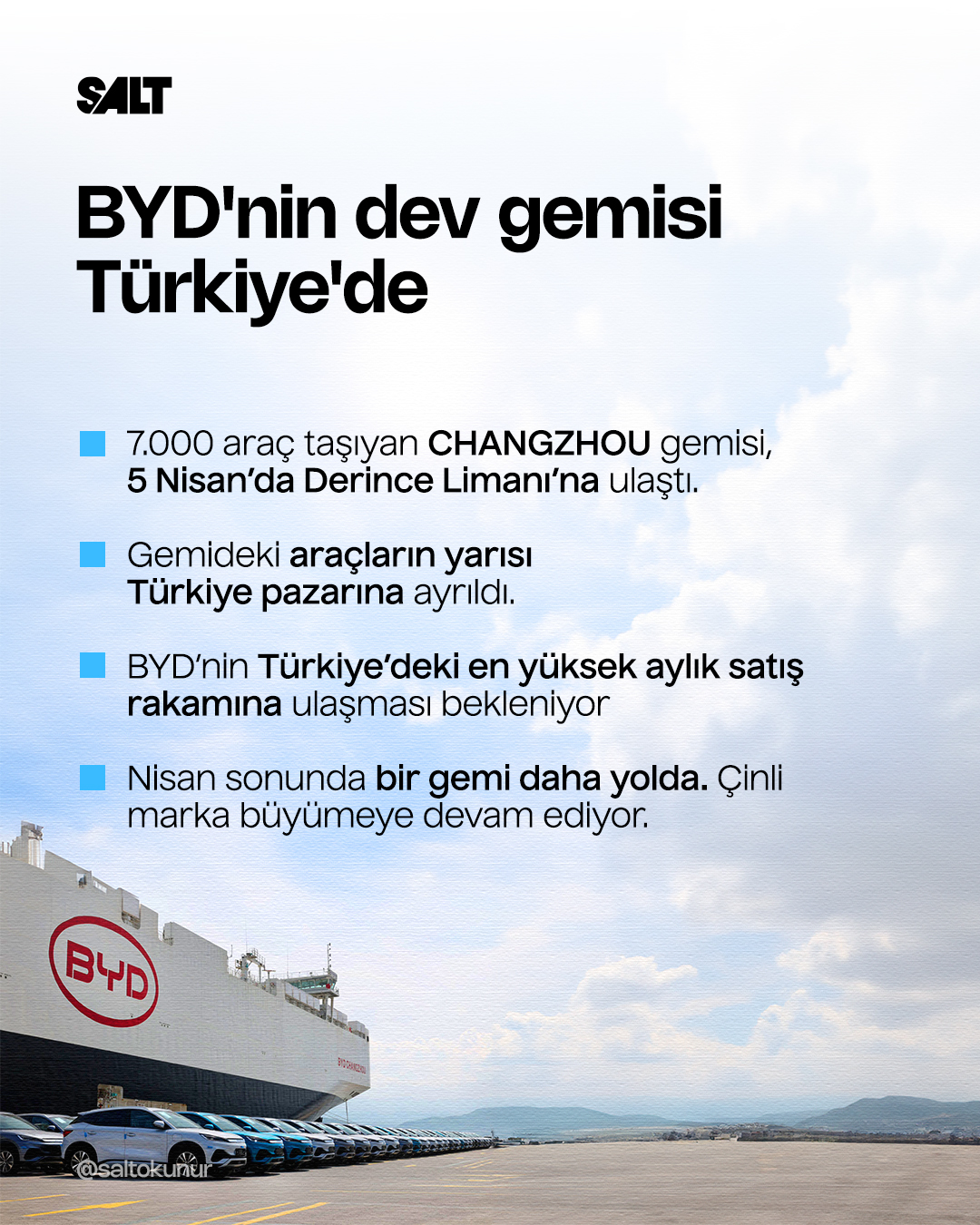 7.000 araç taşıyan gemi Derince Limanı'na ulaştı. Araçların yarısı Türkiye'de satılacak. BYD, nisan ayında satış rekoru kırabilir.