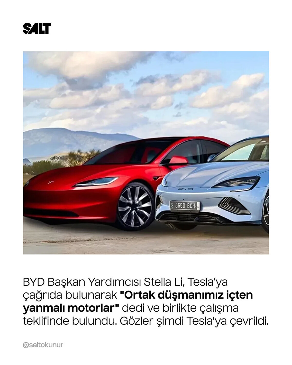 Elektrikli otomobil sektöründe büyük bir işbirliği mi geliyor? Çinli dev BYD'nin Başkan Yardımcısı Stella Li, Tesla'ya açık çağrıda bulunarak "Ortak düşmanımız içten yanmalı motorlar, birlikte çalışmalıyız" dedi. Küresel pazarda elektrikli araçlar hızla yayılırken, iki büyük rakibin işbirliği yapması oyunun kurallarını değiştirebilir mi?