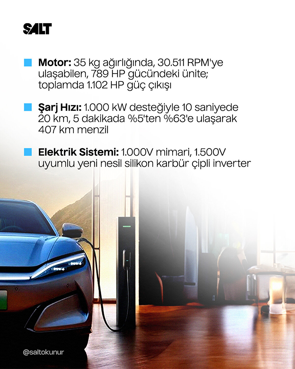 ⚡ 1.000 kW şarj hızına ulaşabilen binek araçlarını duyurdu; bu sayede saniyede 2 km menzil kazanılabiliyor ve 5 dakikada %5'ten %63'e şarj edilebiliyor. 🚗 BYD Han L ve Tang L modelleri, 37 bin dolarlık başlangıç fiyatıyla bu yeni platformu kullanan ilk araçlar oldu. 🔌 Kendi şarj ağını kuracağını duyuran firma, 1.360 kW'lık üniteleriyle tek sokette 1.000 kW şarja imkan sağlayacak; Çin'de 4.000'den fazla istasyon planlanıyor. 🏎️ 789 beygir gücündeki motor, 2,7 saniyede 0-100 km/s hızlanma ve 305 km/s azami hız sunuyor. Ayrıca 1.500V silikon karbür çipli inverter ve gelişmiş LFP bataryalar kullanılıyor. 🚀 Teknoloji şu an üst segmentte, ancak yakında 800V standardı orta segmente de gelecek ve şarj süreleri kısalmaya devam edecek.