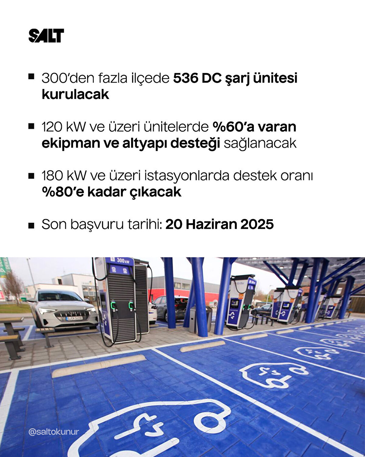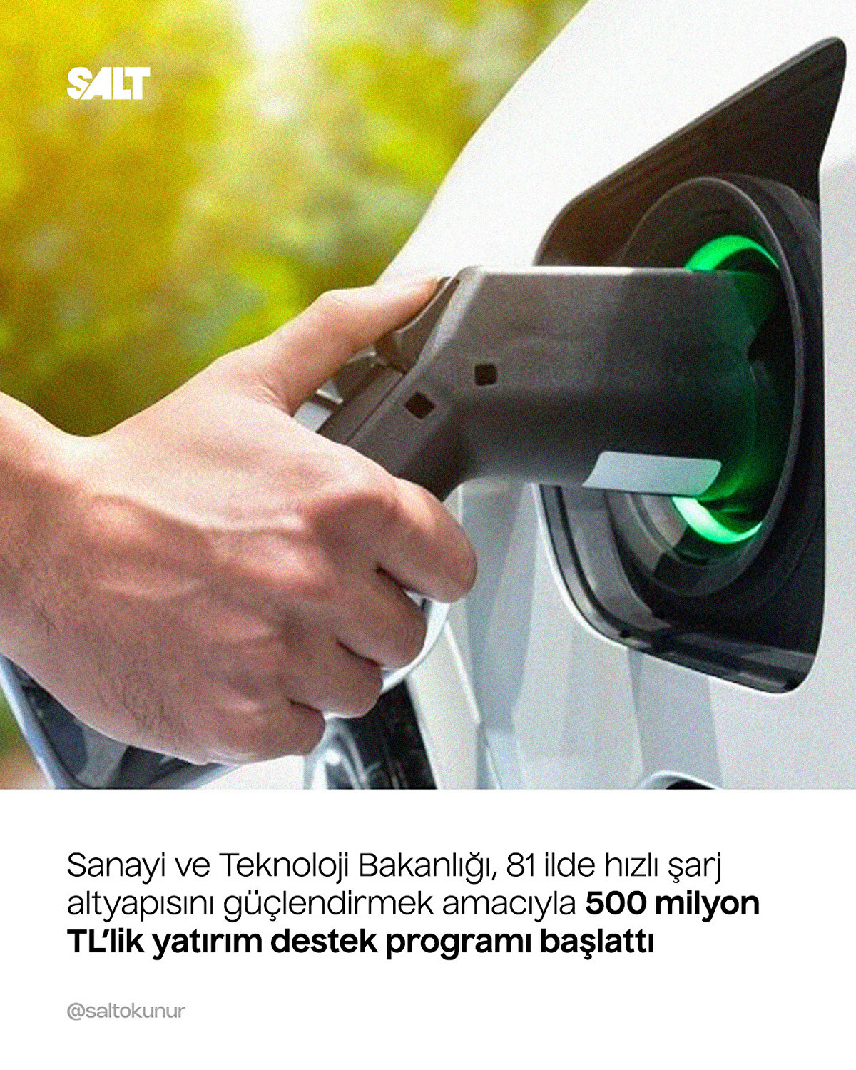 Sanayi ve Teknoloji Bakanlığı, Türkiye genelinde hızlı şarj altyapısını yaygınlaştırmak için 500 milyon TL'lik destek programı başlattı. Program kapsamında 300'den fazla ilçede 536 DC şarj ünitesi kurulacak. 120 kW ve üzeri istasyonlara %60, 180 kW ve üzeri istasyonlara ise %80'e kadar destek sağlanacak.