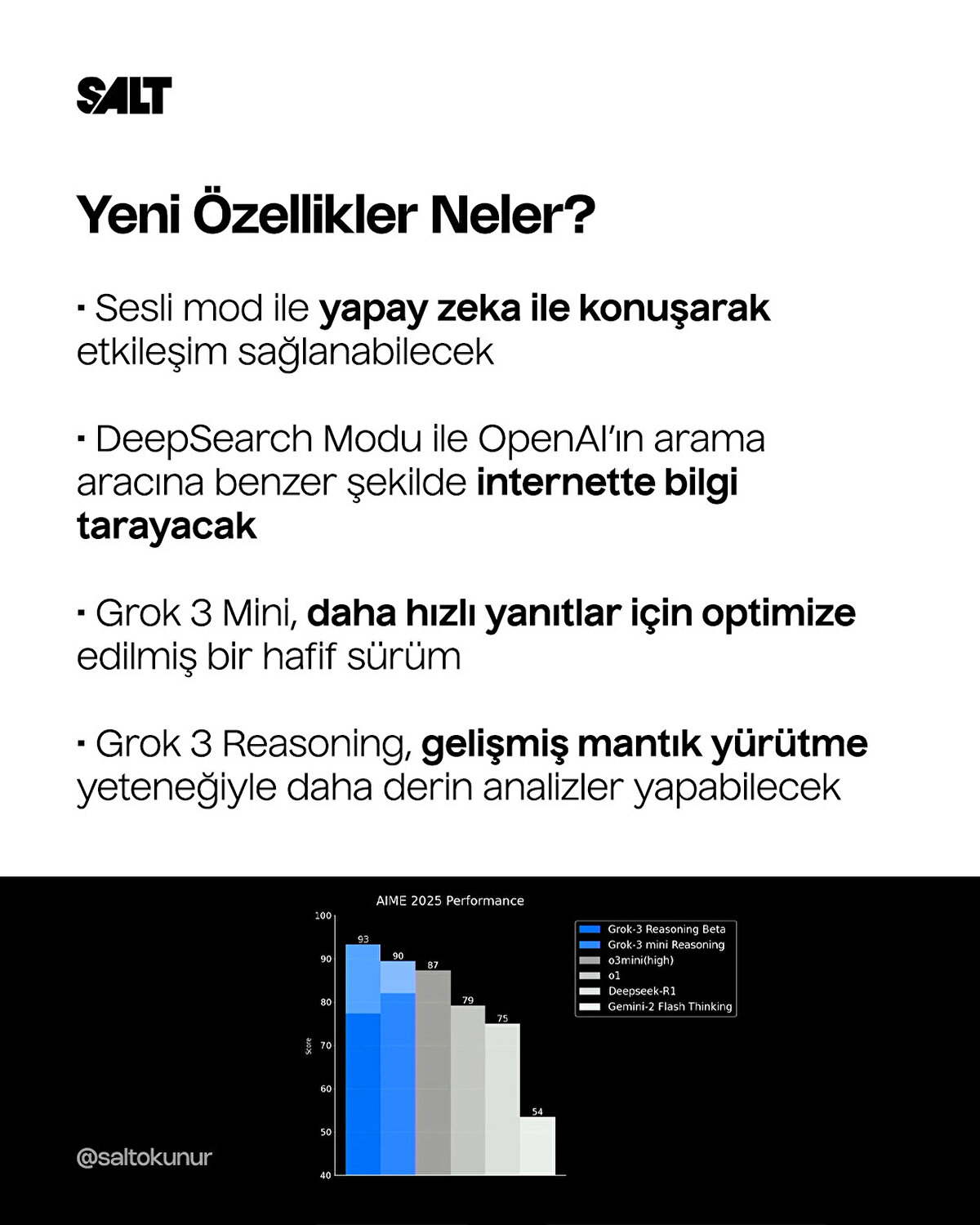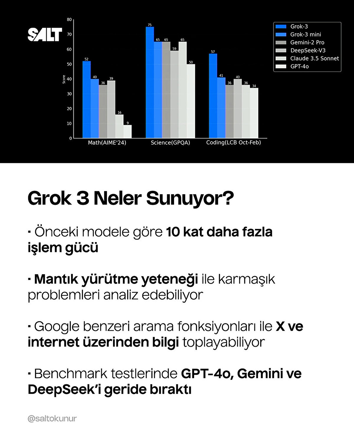 Elon Musk, xAI'ın yeni yapay zeka modeli Grok 3'ü tanıttı. Yapay zeka alanında büyük bir gelişme olarak görülen bu model, mantık yürütme, gelişmiş arama yetenekleri ve üstün işlem gücü ile GPT-4o ve Gemini gibi rakiplerini benchmark testlerinde geride bıraktı.