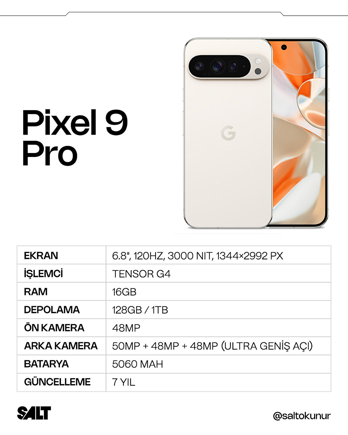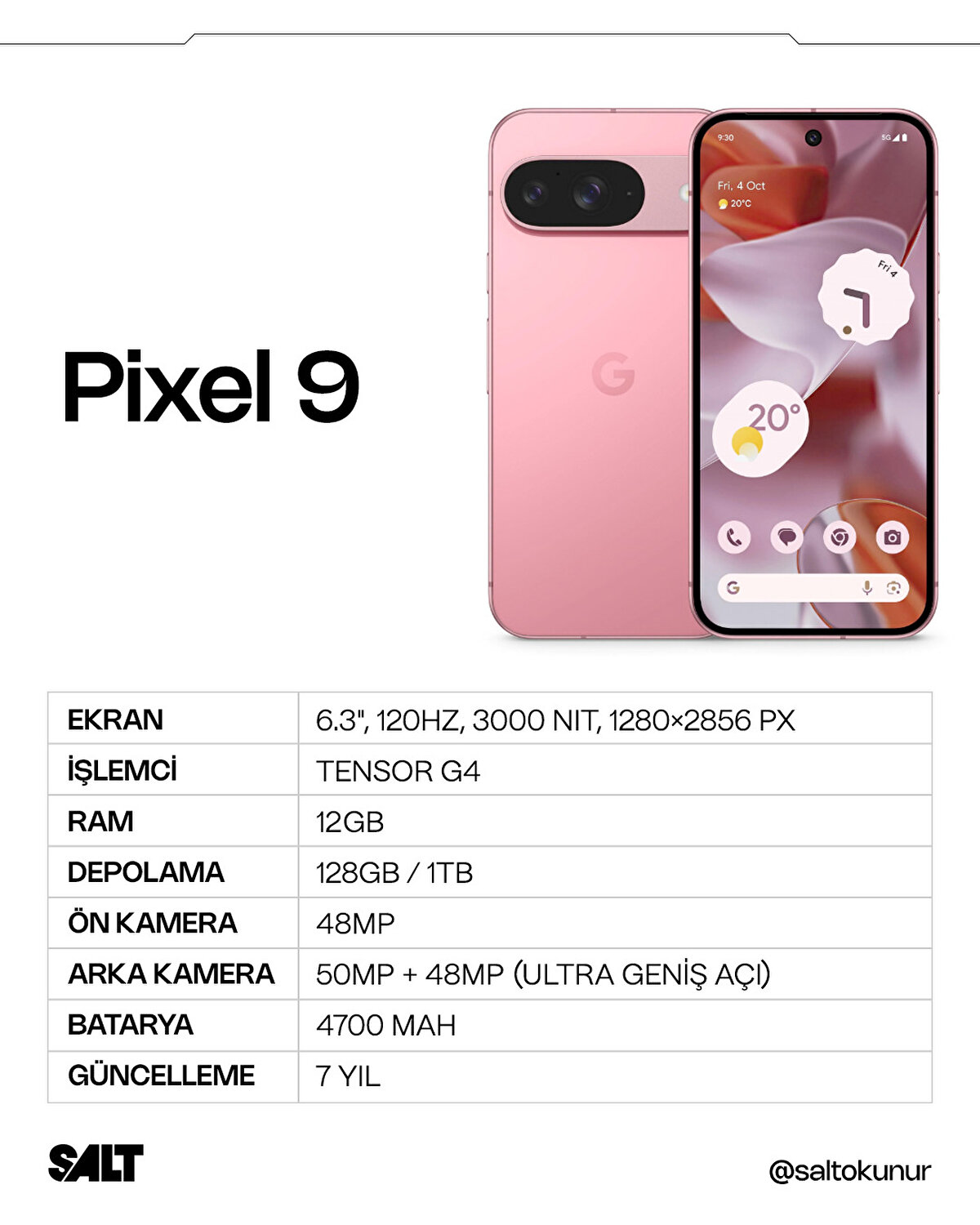 Önümüzdeki haftalarda Türkiye'ye gelmesi beklenen Google Pixel 9 serisinin özellikleri. Başlangıç modeli 799 dolar olan serinin Türkiye fiyatları henüz belli değil.