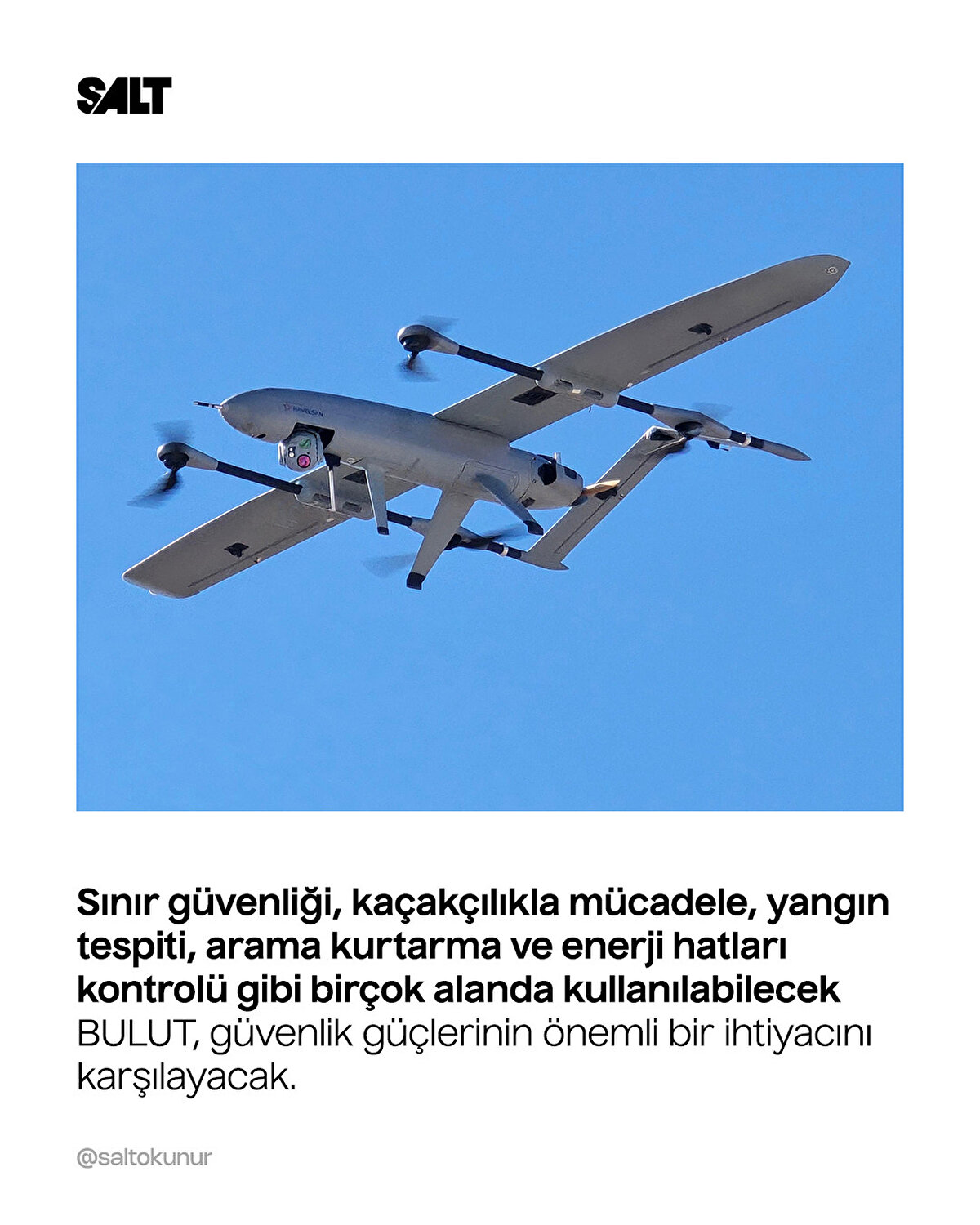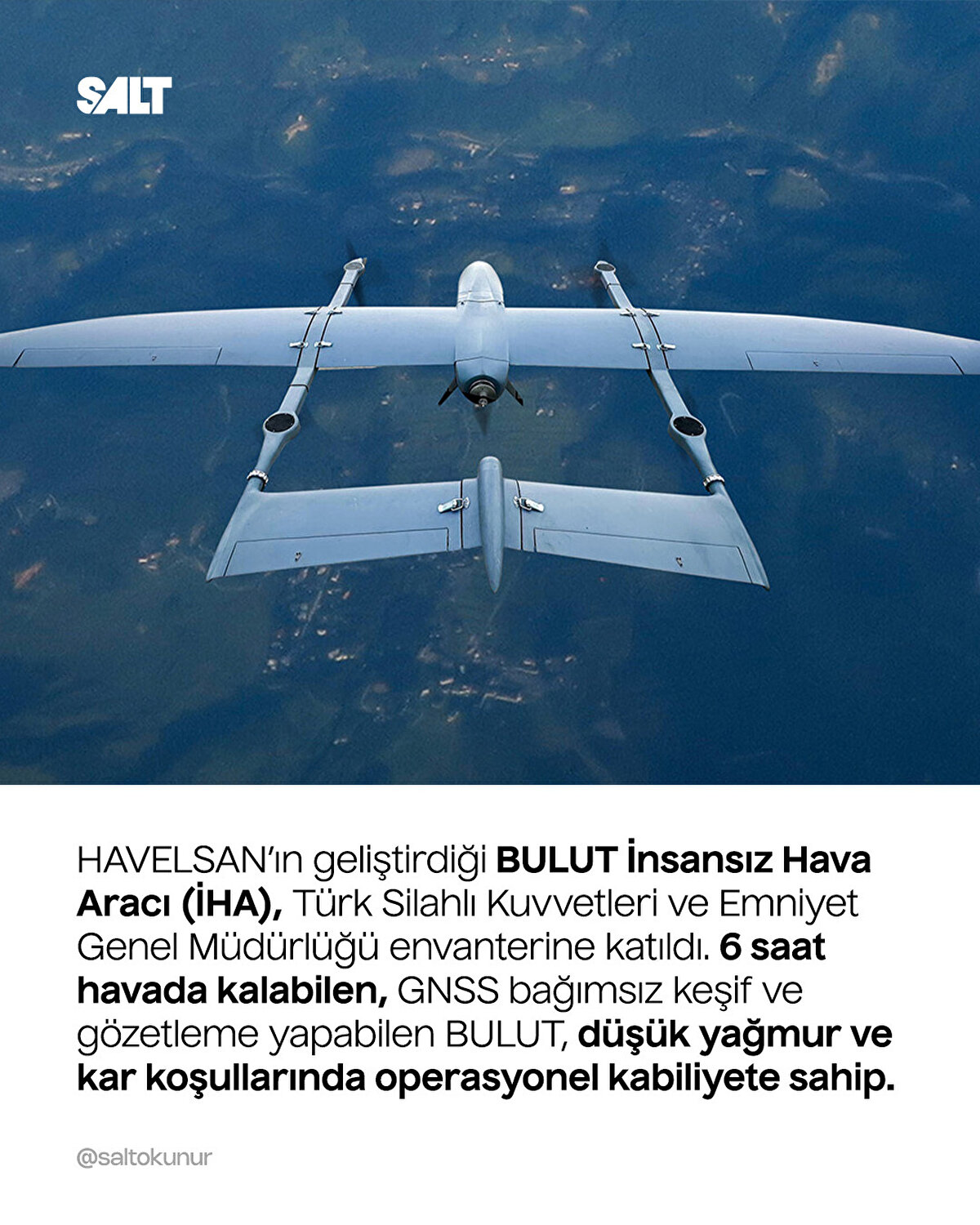 HAVELSAN tarafından geliştirilen BULUT İHA, 6 saat havada kalma süresi, GNSS bağımsız keşif yeteneği ve handover özelliğiyle güvenlik güçlerine önemli bir avantaj sağlıyor. Sınır güvenliği, arama kurtarma, yangın tespiti ve enerji hatları kontrolü gibi birçok alanda görev yapabilecek.