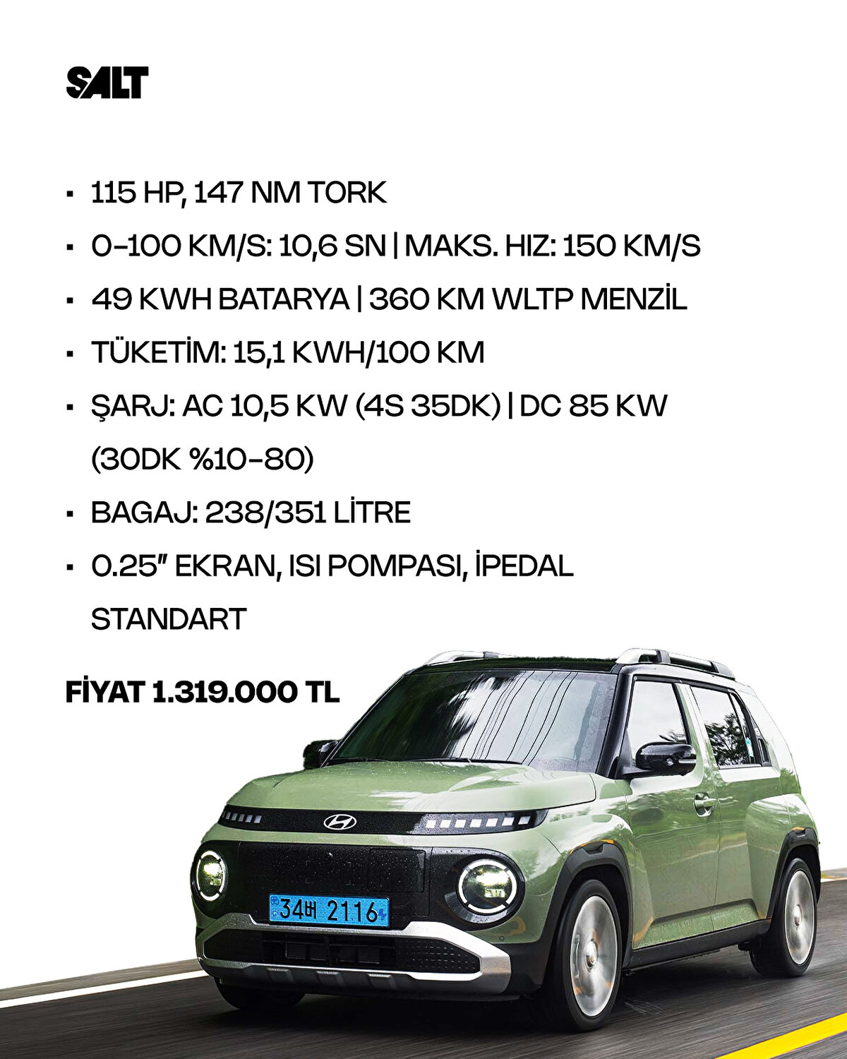 Hyundai'nin tamamen elektrikli yeni modeli Inster satışa sunuldu. 1.319.000 TL'lik fiyat etiketiyle gelen araç, 360 km WLTP menzili, 115 beygir gücü ve hızlı şarj desteğiyle şehir içi kullanım için ideal bir kompakt SUV olarak öne çıkıyor. 49 kWh bataryaya sahip Inster, 0-100 km/s hızlanmasını 10,6 saniyede tamamlıyor. 10.25 inç multimedya ekranı, ısı pompası ve iPedal sistemi gibi özellikler ise donanım tarafında standart olarak sunuluyor.