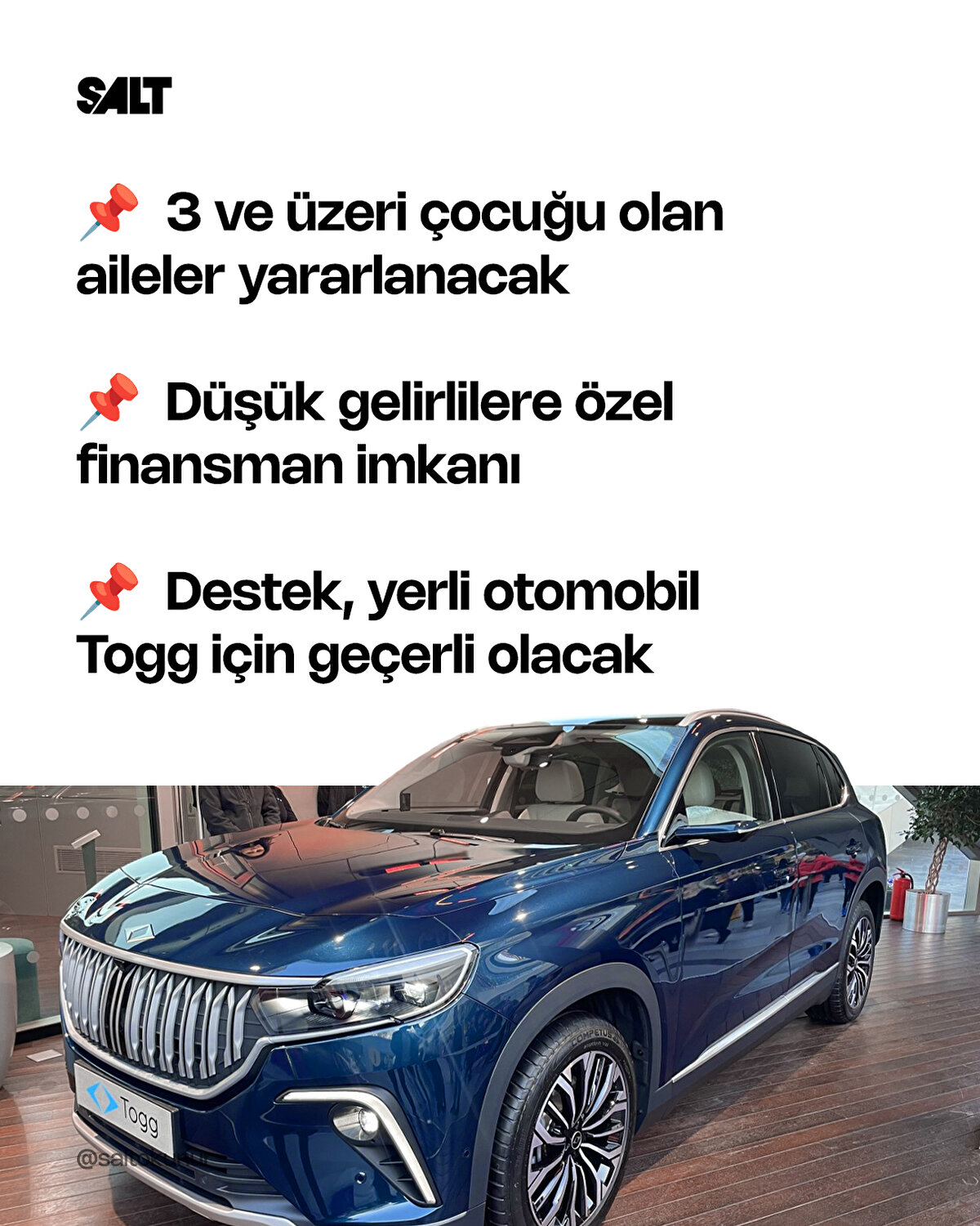 3 ve üzeri çocuğu olan ailelere, yerli otomobil Togg için uygun finansman desteği sağlanacak. Bu kampanya, düşük gelirli ailelerin araç sahibi olmasını kolaylaştırmayı hedefliyor.