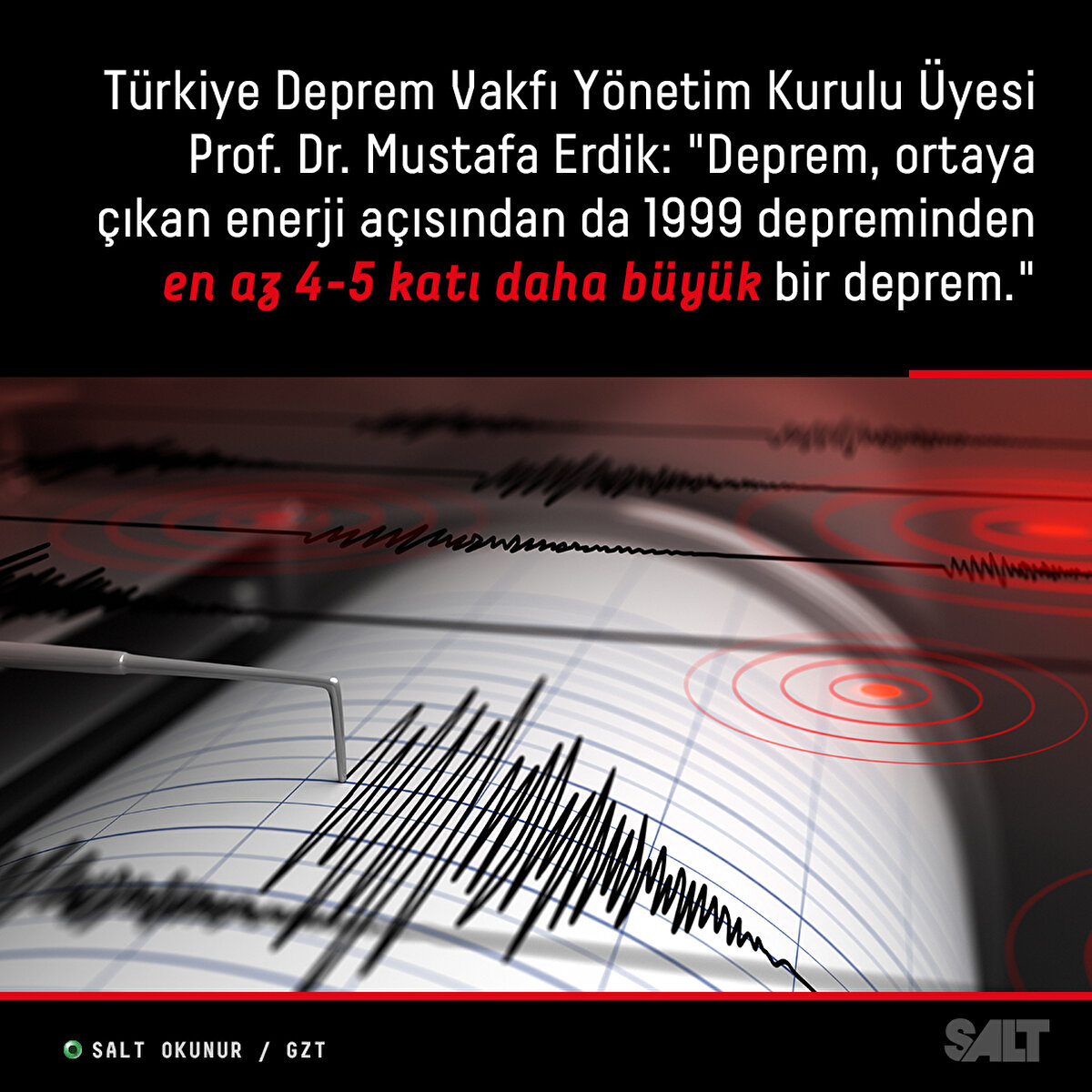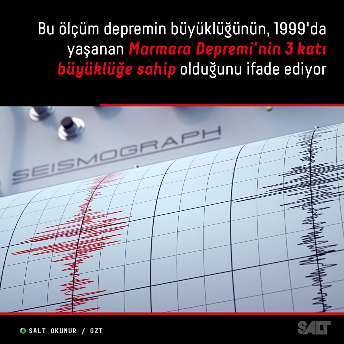 Kahramanmaraş'ta meydana gelen ilk depremin ivmesi 664 gal olarak ölçüldü. Peki biz bundan ne anlamalıyız? Bu ölçüm depremin büyüklüğünün, 1999'da yaşanan Marmara Depremi'nin 3 katı büyüklüğe sahip olduğunu ifade ediyor. 1999'da Gölcük'te meydana gelen depremin büyüklüğü ise 250 - 300 gal aralığında ölçülmüştü. Türkiye Deprem Vakfı Yönetim Kurulu Üyesi Prof. Dr. Mustafa Erdik: "Deprem, ortaya çıkan enerji açısından da 1999 depreminden en az 4-5 katı daha büyük bir deprem." diyor.