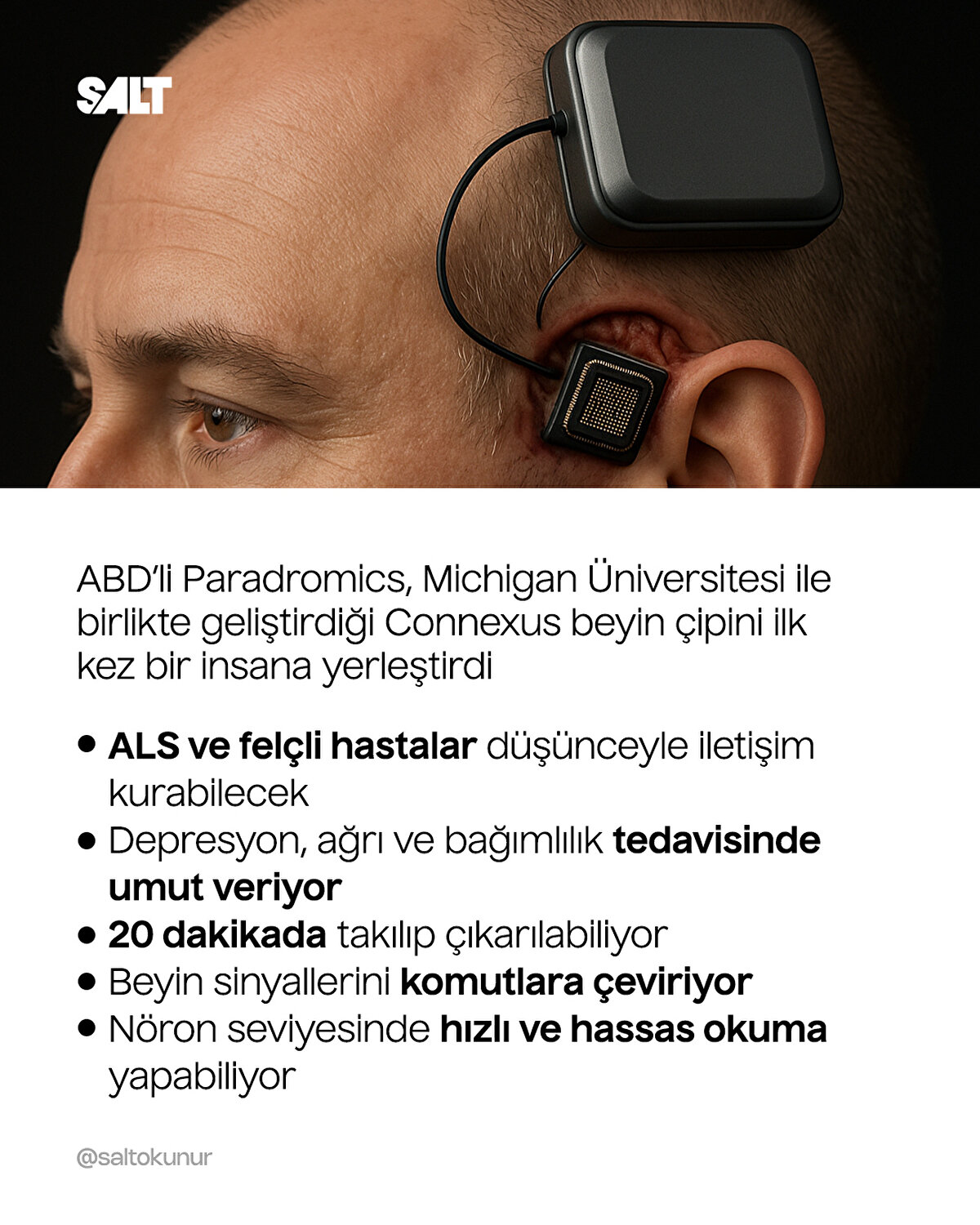 Paradromics, geliştirdiği “Connexus” adlı beyin çipini ilk kez bir insana geçici olarak yerleştirdi. 14 Mayıs'ta Michigan Üniversitesi'nde epilepsi tedavisi gören bir hastanın beyninde 20 dakika boyunca test edilen cihaz, sinirsel verileri başarıyla kaydetti. Konuşma yetisini kaybetmiş bireylerin iletişim kurmasına yardımcı olması hedeflenen çip, klinik denemelere geçmeden önce düzenleyici onay bekliyor. Şirket bugüne kadar 100 milyon dolar yatırım aldı ve NEOM projesiyle iş birliği yaptı.