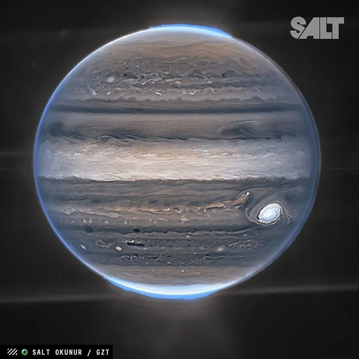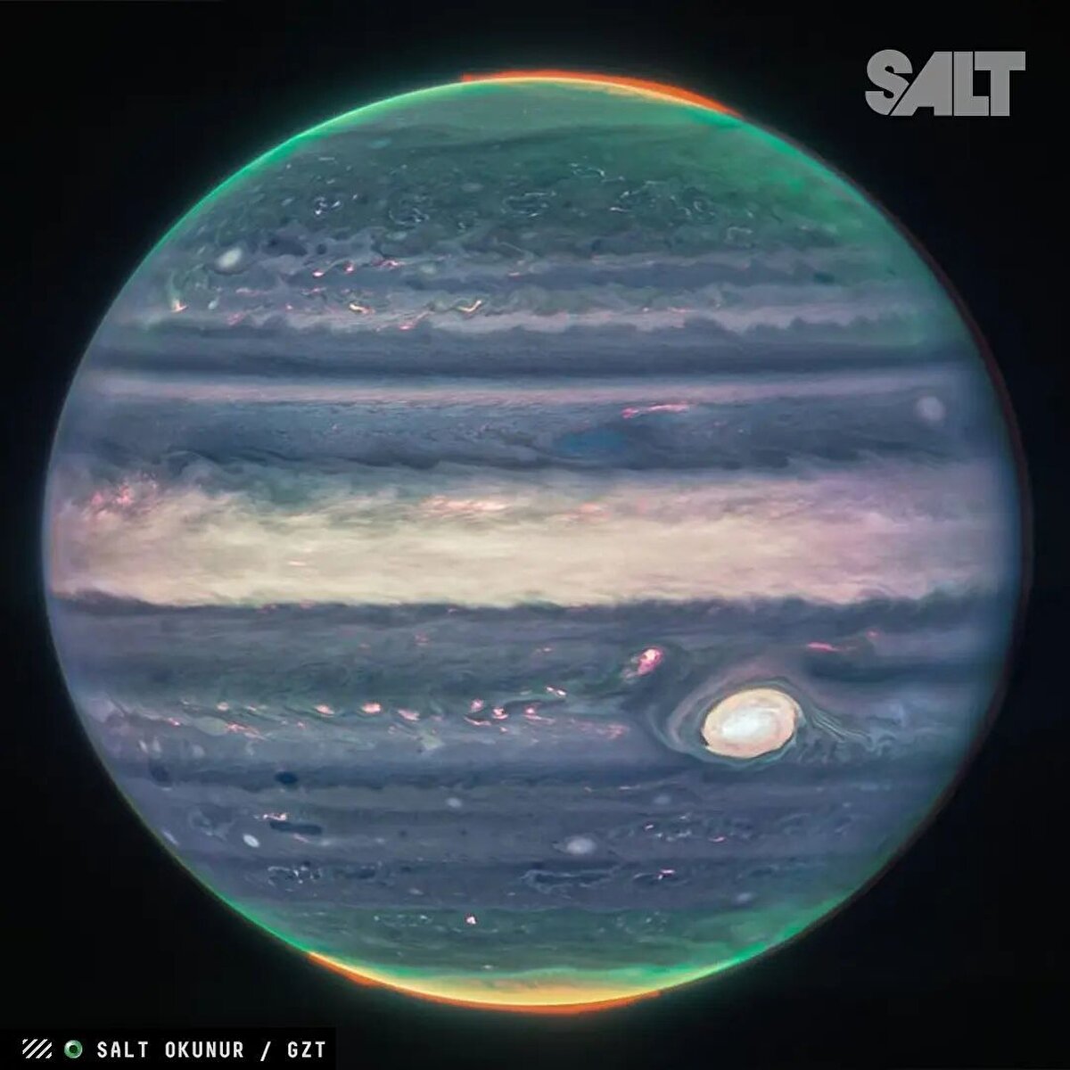 Fotoğrafta; Jüpiter'in Kuzey ve Güney Kutbu'ndaki auroraları, uyduları ve ikonik 'fırtınasını' görebilirsiniz.