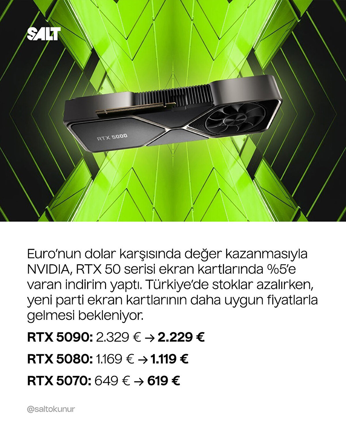 Globalde euro'nun dolar karşısındaki artışı sonrası döviz kurlarında oluşan bu iyileşmeyle NVIDIA, yeni nesil ekran kartlarının fiyatlarında yaklaşık %5 oranında bir indirim yaptı.