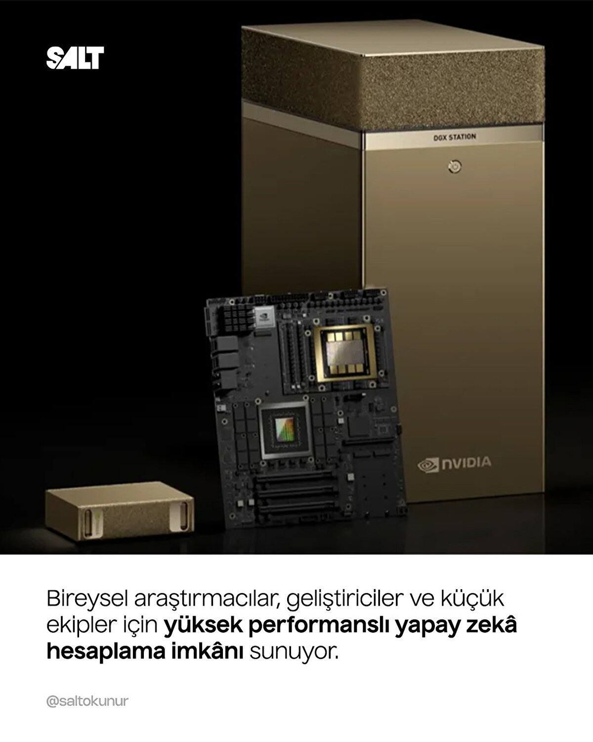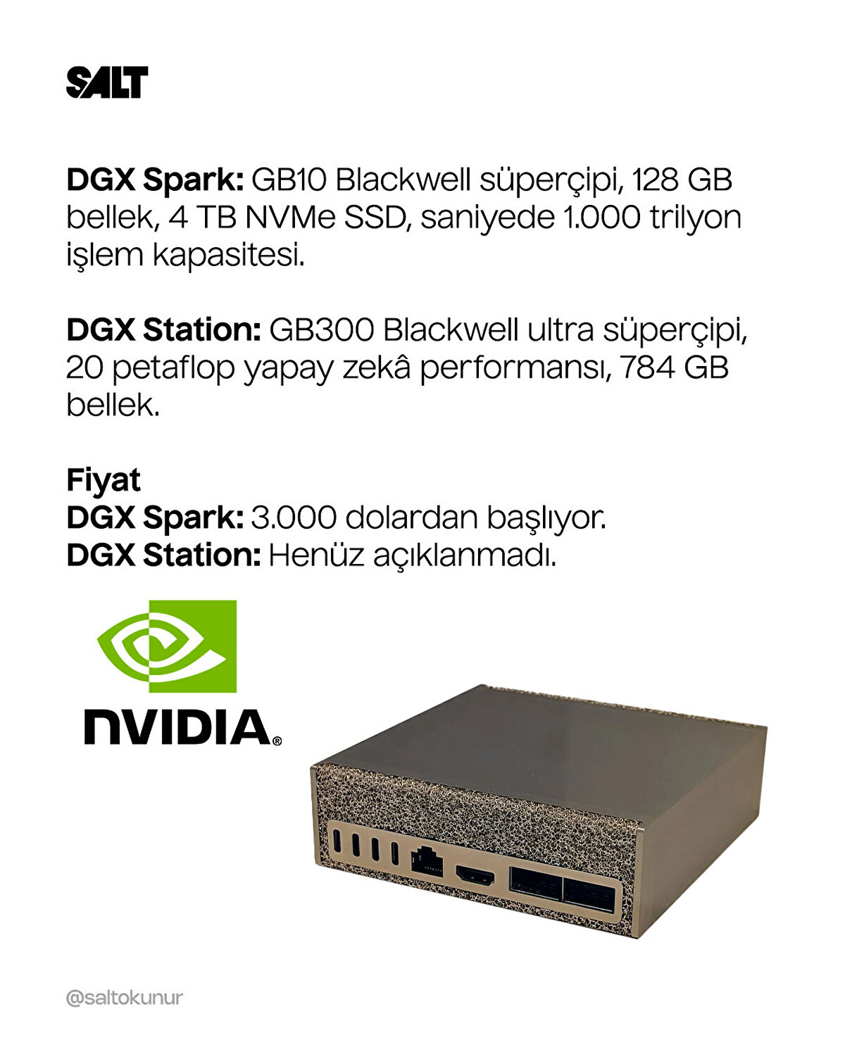 DGX Spark ve DGX Station, bireysel araştırmacılar ve küçük ekipler için yapay zekâ geliştirme imkânı sunuyor. DGX Spark, 128 GB bellek ve saniyede 1.000 trilyon işlem kapasitesine sahipken, daha güçlü DGX Station 20 petaflop performans ve 784 GB bellek sunuyor. DGX Spark'ın fiyatı 3.000 dolardan başlarken, DGX Station için henüz açıklama yapılmadı.
