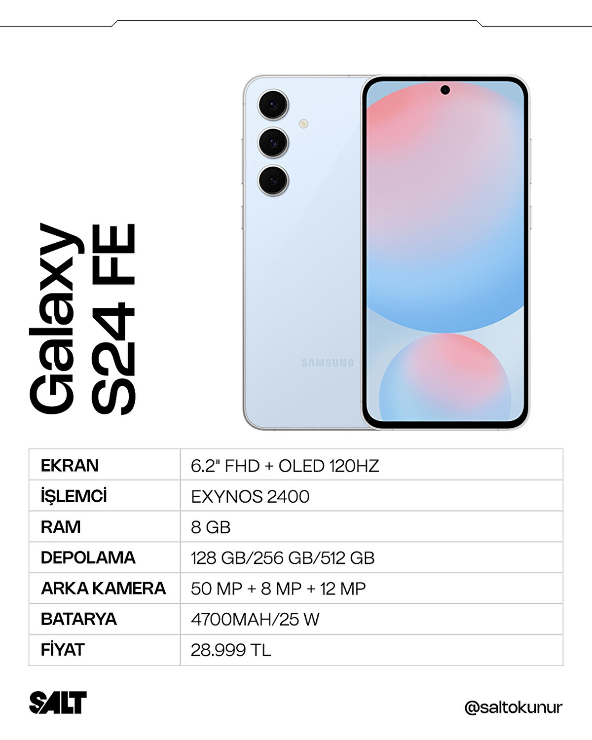 Samsung Galaxy S24 FE'nin fiyatı ve özellikleri belli oldu. Samsung'un geçtiğimiz günlerde tanıttığı yeni modeli Samsung Galaxy S24'ün Türkiye başlangıç fiyatı 28.999 TL oldu. Bu model orta segment olarak kabul edilse de sahip olduğu donanım özellikleri nedeniyle bazı kullanıcılar telefonun amiral gemisi seviyesinde olduğunu düşünüyor.