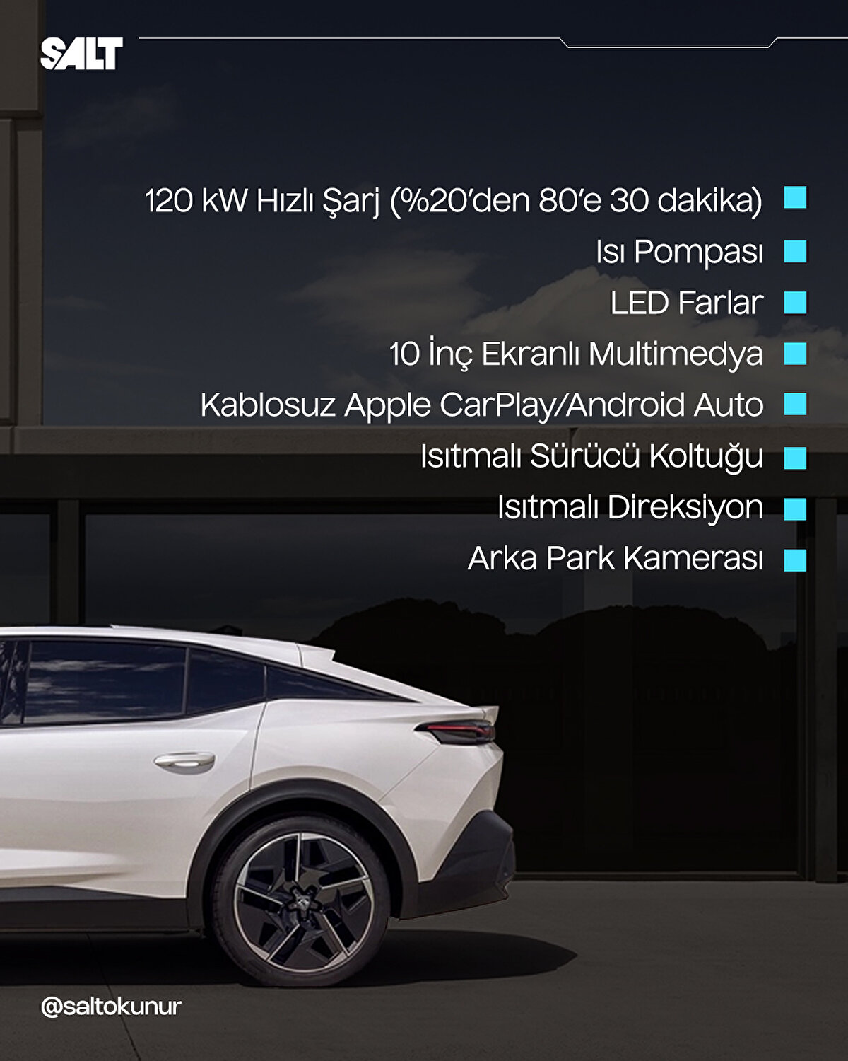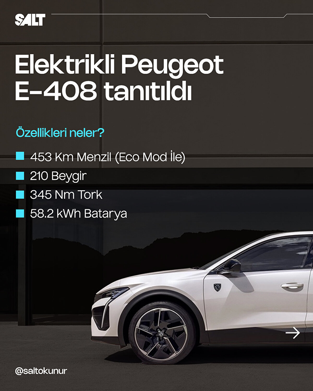 Peugeot, 408 modelinin tamamen elektrikli versiyonu olan E-408'i tanıttı. Bu model, 453 km'ye kadar menzil sunuyor ve benzinli, hibrit ve plug-in versiyonlarının yanı sıra elektrikli bir seçenek olarak piyasaya sürülecek. Standart Allure donanım paketi, LED farlar, 19 inç jantlar ve multimedya sistemi gibi özellikler sunarken, daha pahalı GT donanım paketi, Matrix farlar, elektrikli bagaj kapağı ve premium hoparlörler gibi ek olanaklar içeriyor. Peugeot E-408, önümüzdeki aylarda Türkiye'de satışa sunulacak.