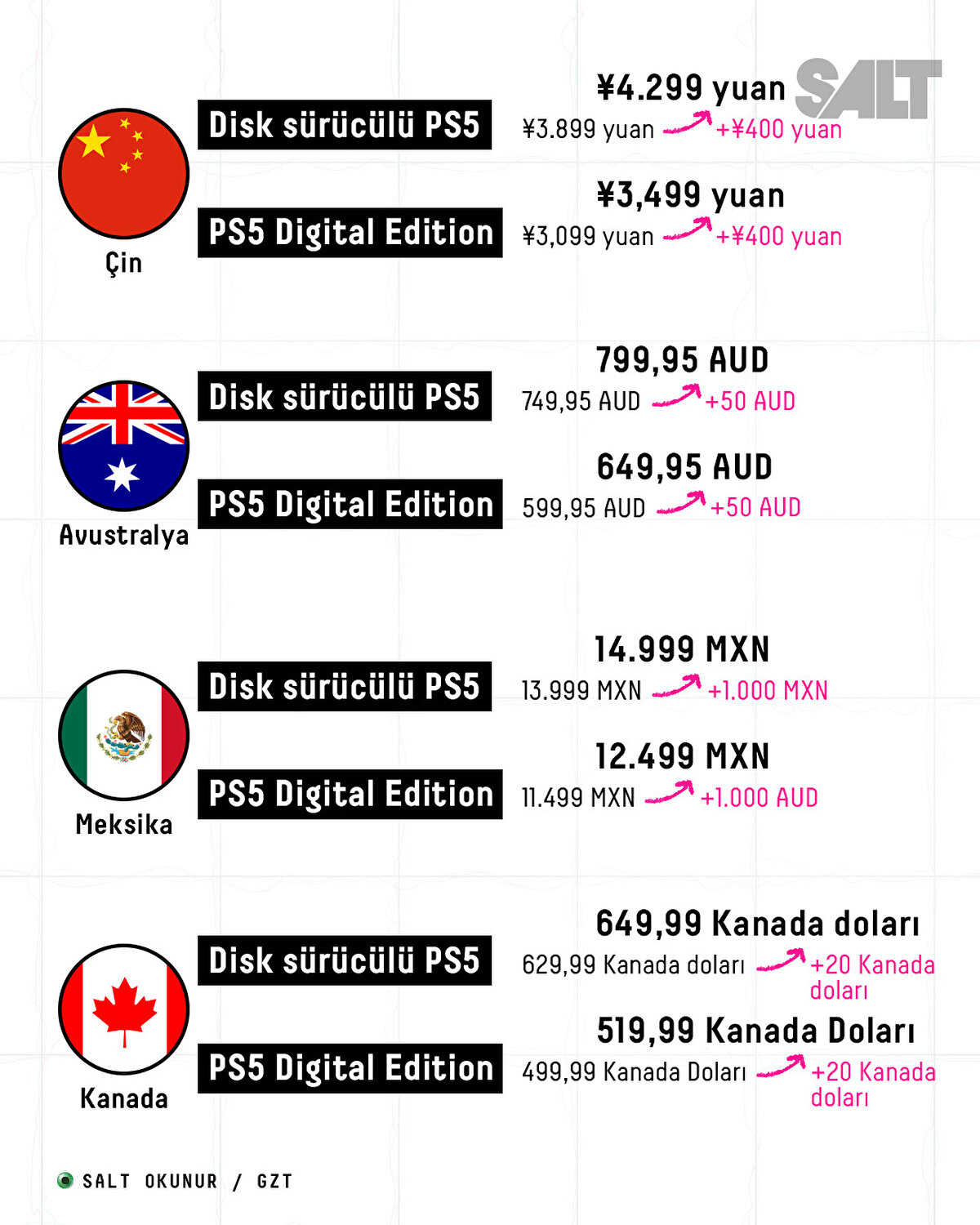 Sony, Avrupa, İngiltere, Çin, Avustralya, Meksika ve Kanada'da satılan PlayStation 5'lerde 30 ila 100 dolar arası zam yapıldığını açıkladı. Karar alınır alınmaz zam hemen uygulanmaya başladı.
