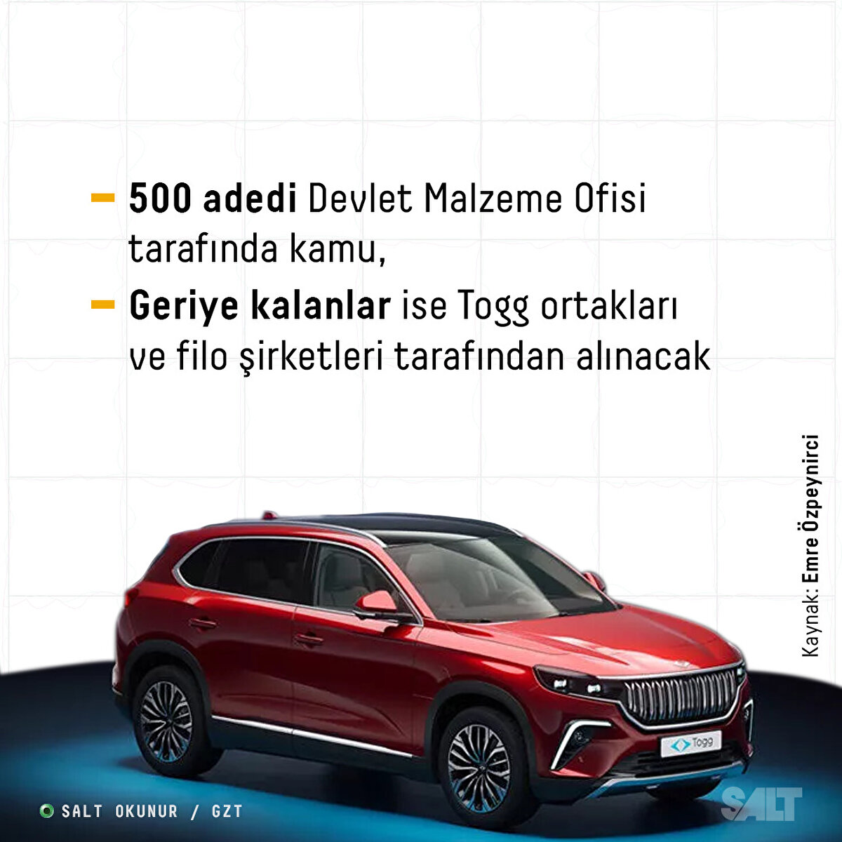 📌2023'te üretilmesi planlanan araç miktarı 20 bin olarak planlanıyor. Bu araçların; 12 bini çekilişe katılan tüketiciler, 2023 adedi 100. yıla özel Kasım ayında gerçekleştirilen NFT açık artırmasına katılanlar, 500 adedi Devlet Malzeme Ofisi tarafından kamu, geri kalanı ise Togg ortakları ve filo şirketleri tarafından satın alınacak.