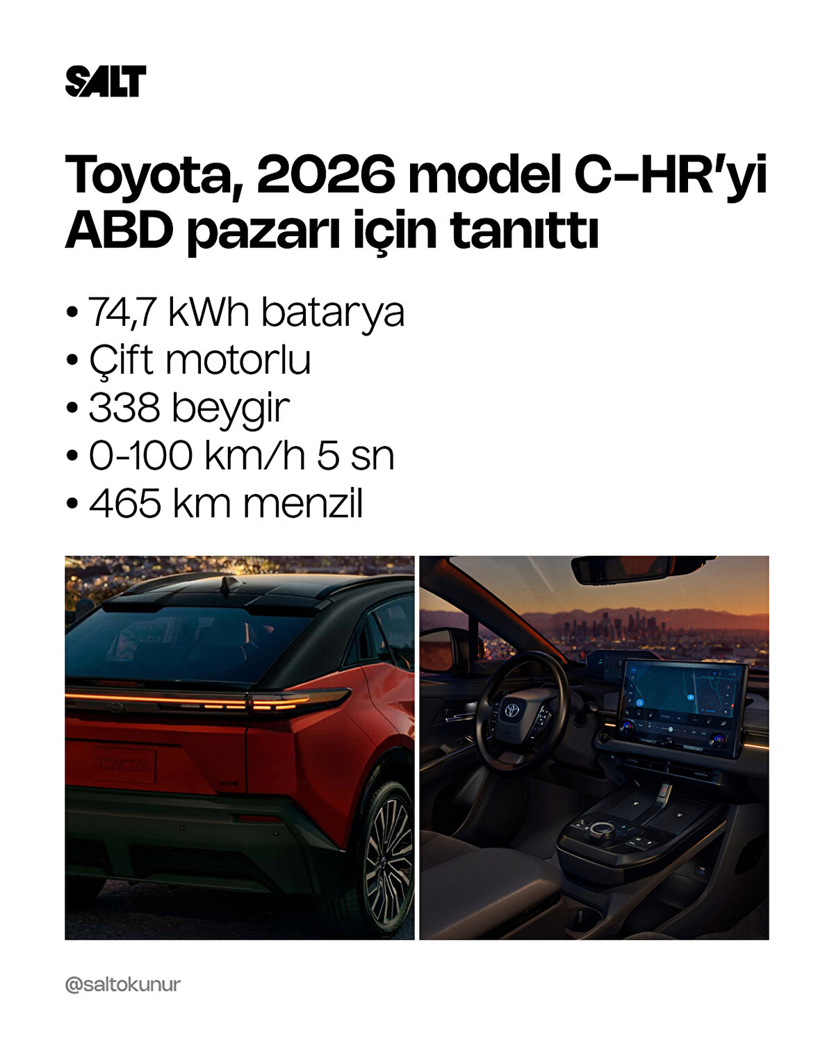 Toyota, C-HR modelinde yeni bir dönemin kapısını araladı. Artık hibrit değil, tamamen elektrikli! 2026 model C-HR, ABD pazarına özel tanıtıldı ve teknik özellikleriyle dikkat çekiyor: