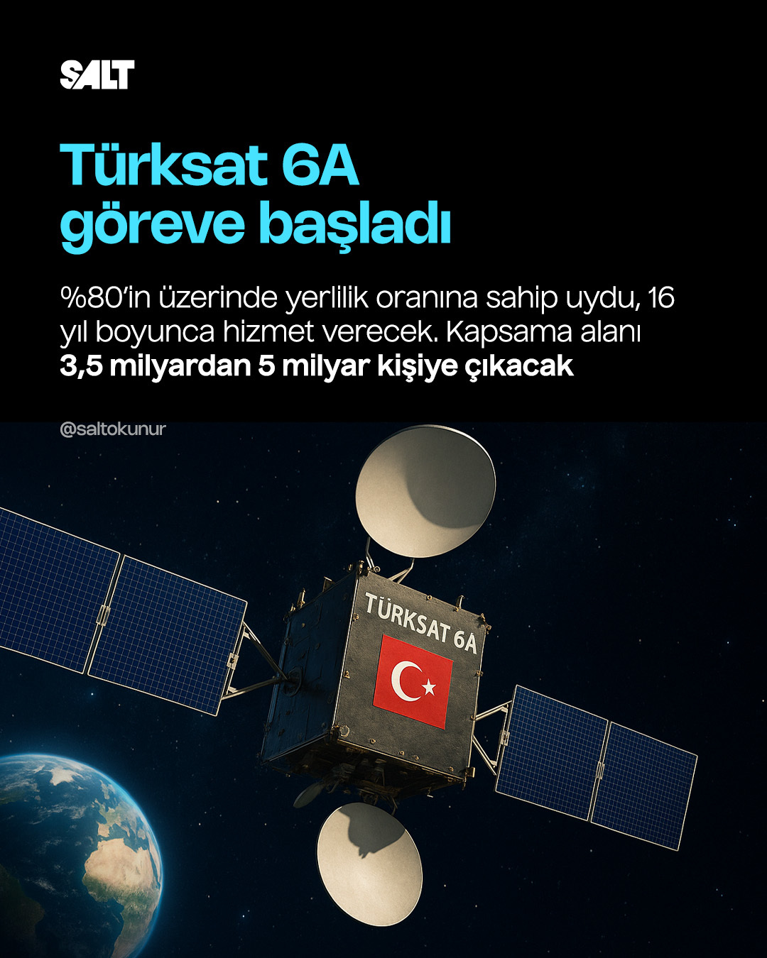 Türkiye'nin ilk yerli ve millî haberleşme uydusu Türksat 6A, görevine resmen başladı. 16 yıl boyunca hizmet verecek olan uydu, 5 milyar kişiye ulaşacak kapsama alanıyla Türkiye'nin uzaydaki gücünü artırıyor.