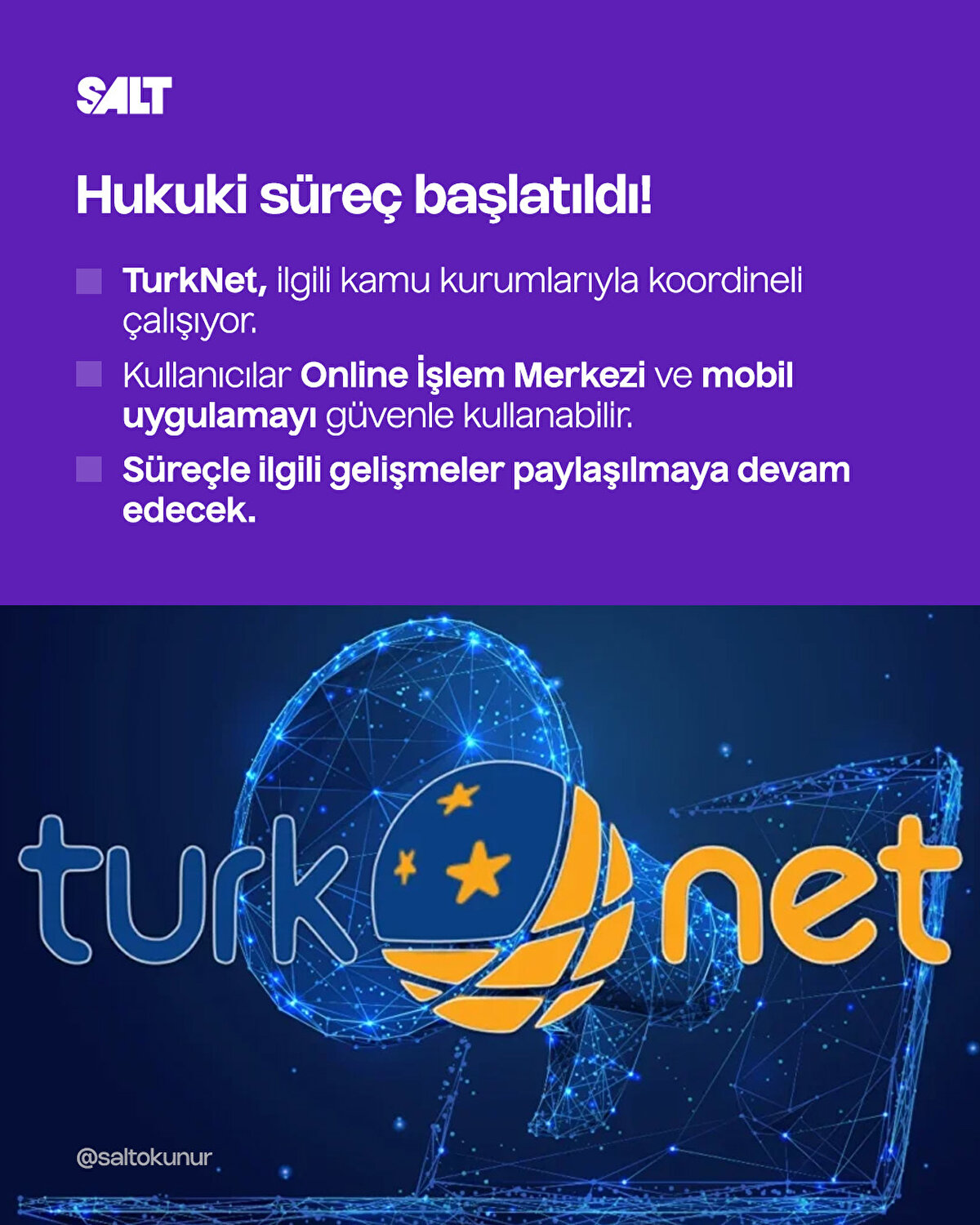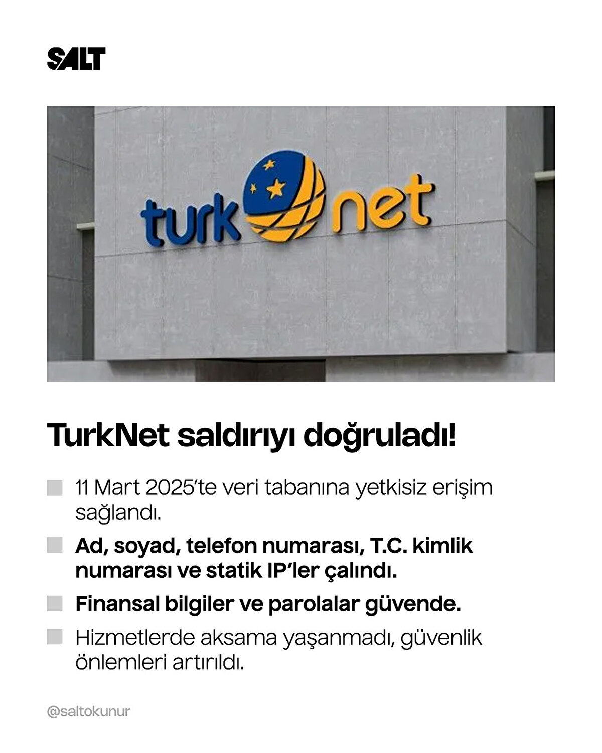 11 Mart 2025'te TurkNet'e yönelik bir siber saldırı gerçekleşti. Şirketten yapılan açıklamaya göre, finansal bilgiler ve parolalar güvende ancak ad, soyad, telefon numarası, T.C. kimlik numarası ve statik IP gibi kişisel veriler ele geçirildi. TurkNet, ilgili kamu kurumlarıyla hukuki sürecin başlatıldığını ve güvenlik önlemlerinin artırıldığını duyurdu. Kullanıcılar Online İşlem Merkezi ve mobil uygulamayı mevcut parolalarıyla güvenle kullanabilir.