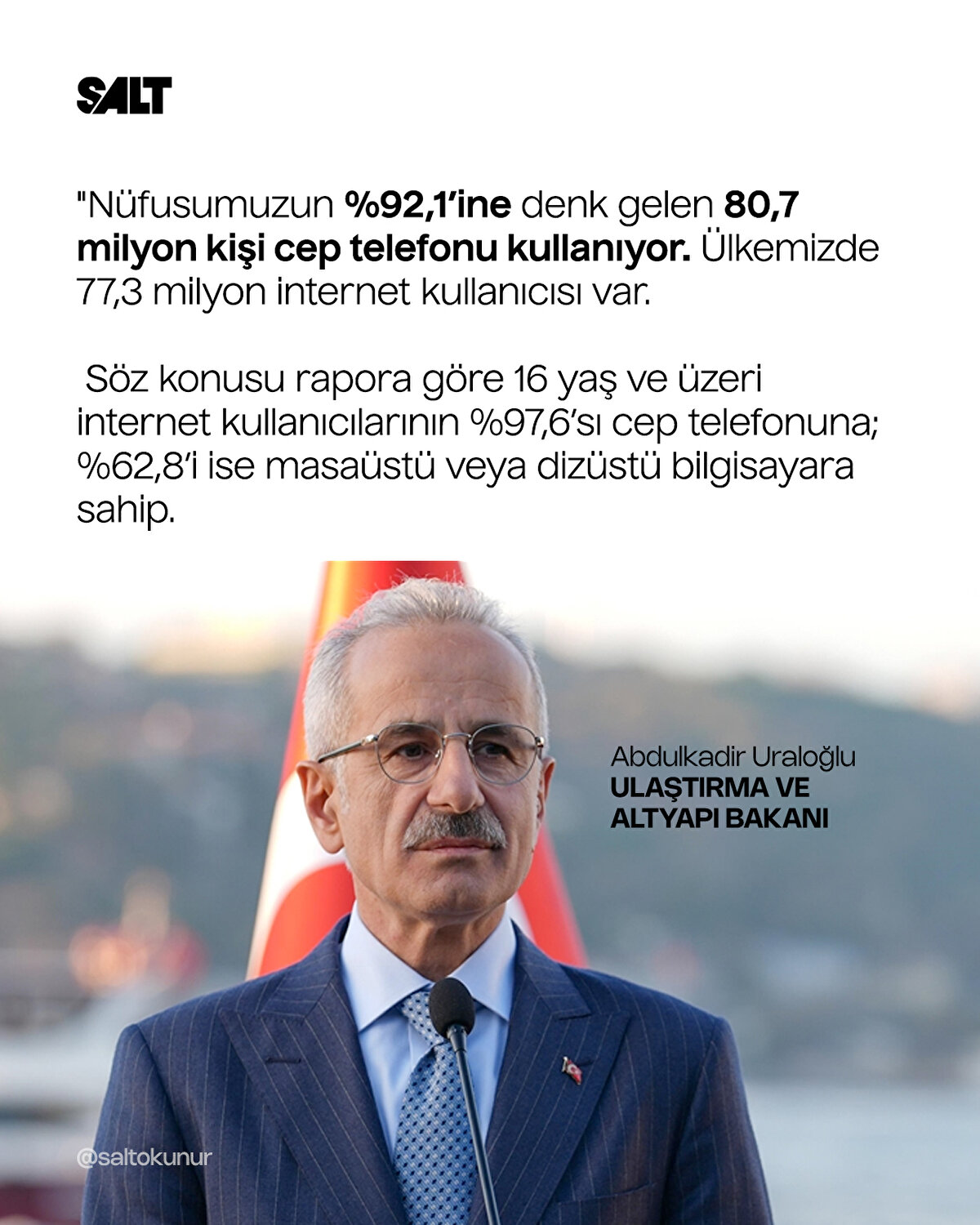 Ulaştırma ve Altyapı Bakanı Abdulkadir Uraloğlu'nun paylaştığı verilere göre, Türkiye'de cep telefonu kullanımı oldukça yaygın. 80,7 milyon kişi cep telefonu kullanıyor, bu da nüfusun %92,1'ine denk geliyor. Ayrıca ülkede 77,3 milyon internet kullanıcısı var. Bu kullanıcıların büyük kısmı, yani %97,6'sı internete cep telefonuyla erişiyor. Bilgisayar sahipliği ise daha düşük; sadece %62,8'i masaüstü veya dizüstü bilgisayara sahip.