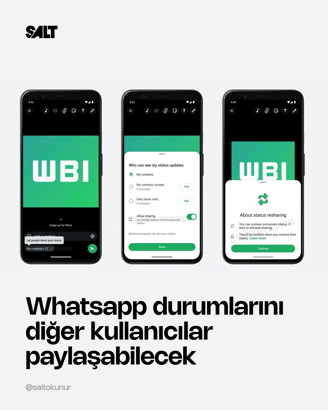 Yeni özellik ile birlikte Whatsapp durumlarını diğer kullanıcılar paylaşabilecekler
