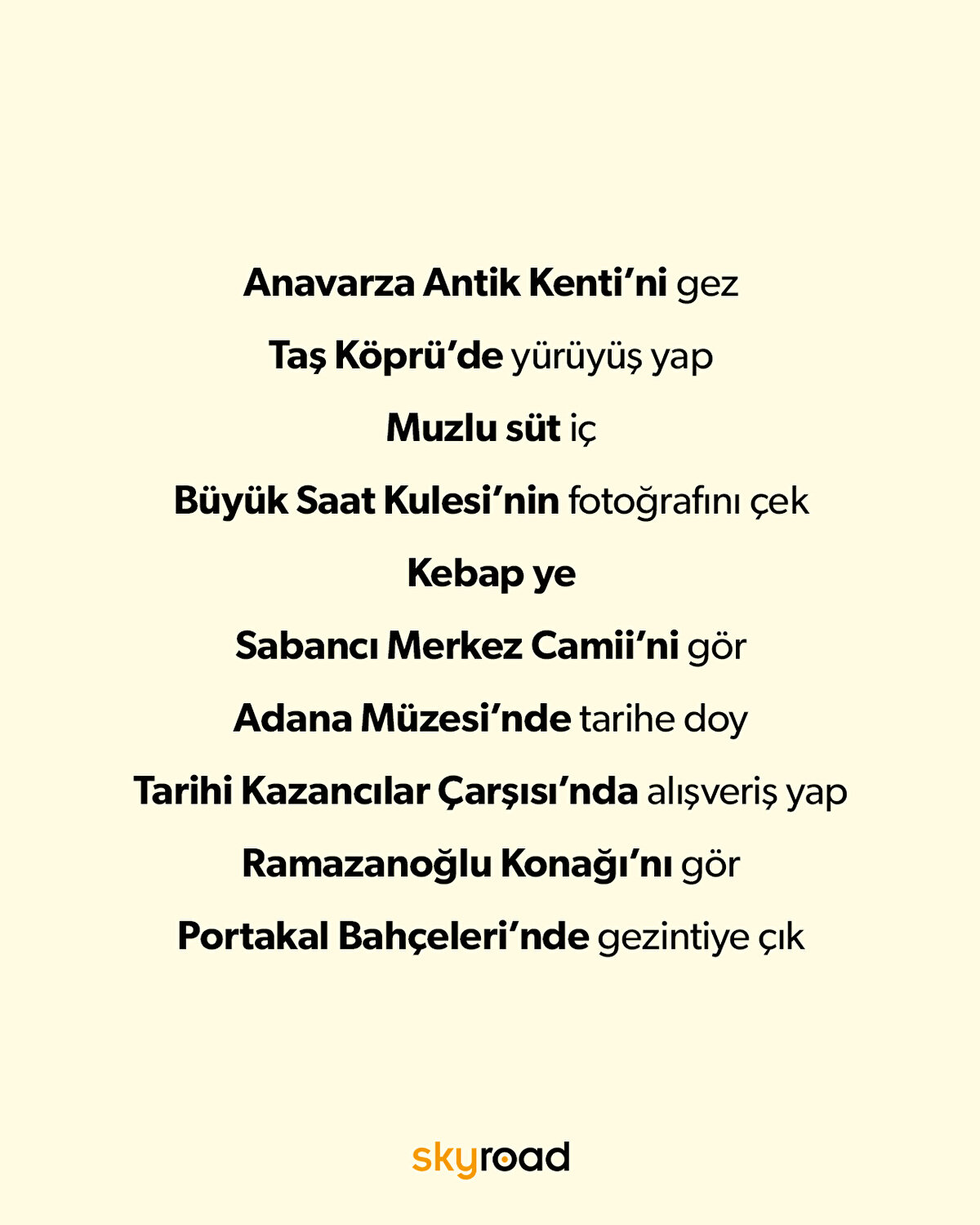 Tarihi Taşköprü üzerinden yürüyerek şehrin geçmişine tanıklık edebilir, Sabancı Merkez Camii'nin ihtişamını yakından görebilirsiniz. Adana kebabının tadına bakmak, lezzet yolculuğunun vazgeçilmez bir parçası. Kazancılar Çarşısı gibi yerel pazarlar, hem hediyelik eşya hem de yöresel ürünler için olmazsa olmaz duraklardan biri. Adana Müzesi gibi kültürel duraklar, şehrin tarihini daha yakından tanımak isteyenler için ideal mekan biri. Sıcakkanlı insanları, hareketli sokakları ve zengin mutfağıyla Adana, her yaştan misafirine unutulmaz anılar bırakır.