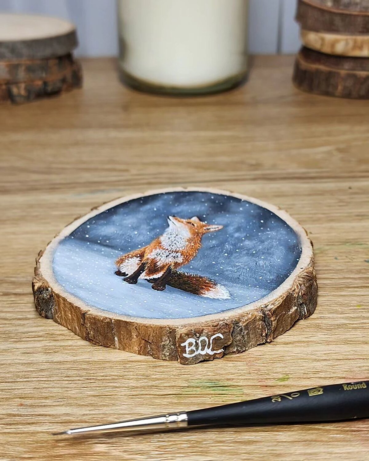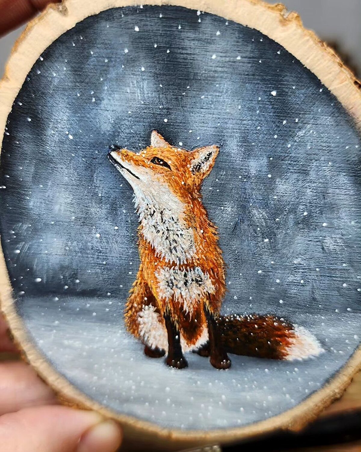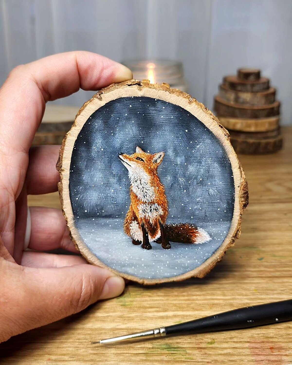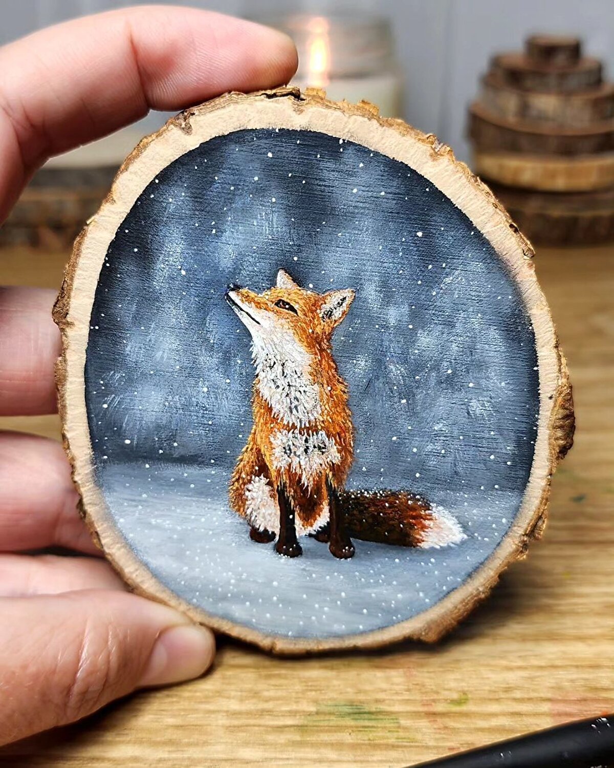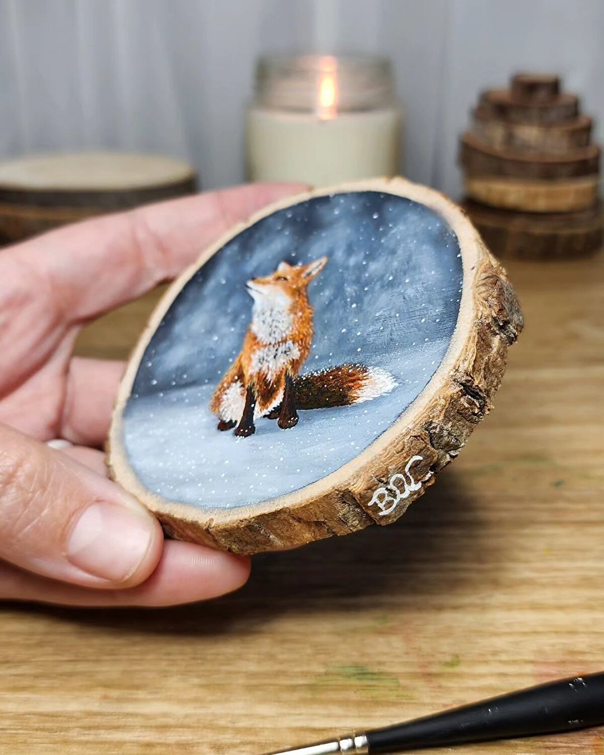 Küçük ahşap parçalar üzerine akrilik boya ile eşsiz eserler ortaya çıkaran Amerikalı çizer Bethany Ann C.; bazen yıldızlarla dolu bir gökyüzünü seyreden tilkiyi, bazen bir kış gününde karla kaplanmış ormanı, bazen de güneşin batmak üzere olduğu hayran kalınası bir gün batımını çiziyor. Yuvarlak ahşap dilimler üzerine film sahnelerini anımsatan ve gerçek hayatta da rastlanabilecek manzaralar işleyen @mytimelesstimber_art, eserlerinde genellikle doğadan ilham aldığını söylüyor. Her detayın ince bir işçilik ve dikkatle yapıldığını ilk bakışta anlayabileceğin bu minik ahşap sanat eserleri; kolye, bileklik ve mini dekor eşyası olarak satın alınabiliyor.