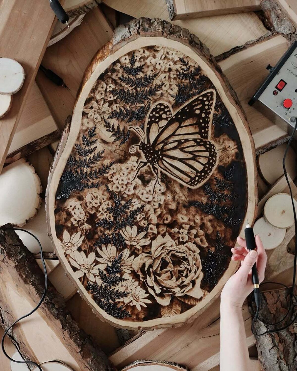 Kanadalı bir sanatçı olan Court O'Reilly (@hippienorth), yoga eğitmeni ve doğa tutkunu olmasıyla tanınıyor. Sanatçı, 2016 yılından beri ahşap yakma sanatıyla, doğanın güzelliklerini ve hayal dünyasını birleştirdiği eserler ortaya koyuyor. O'Reilly, sürdürülebilir şekilde elde ettiği ahşap levhaları hayvan portreleri, manzaralar ve mimari tasarımlar gibi gerçekçi tasarımları için tuval olarak kullanıyor.