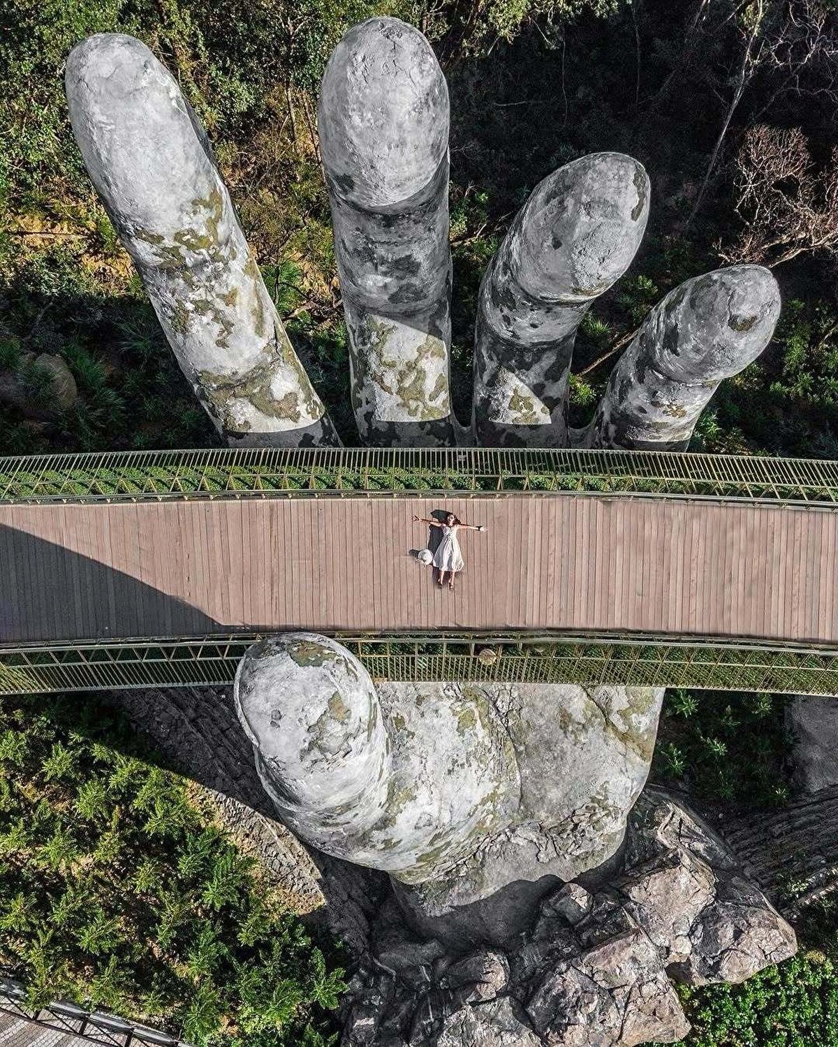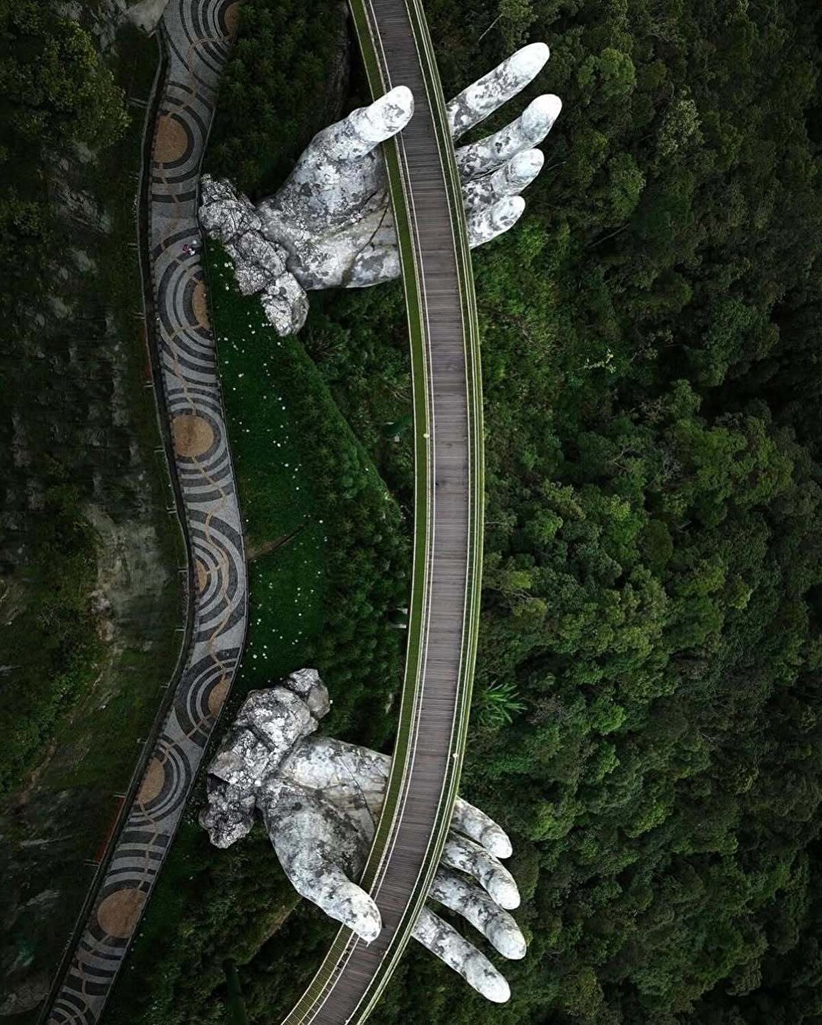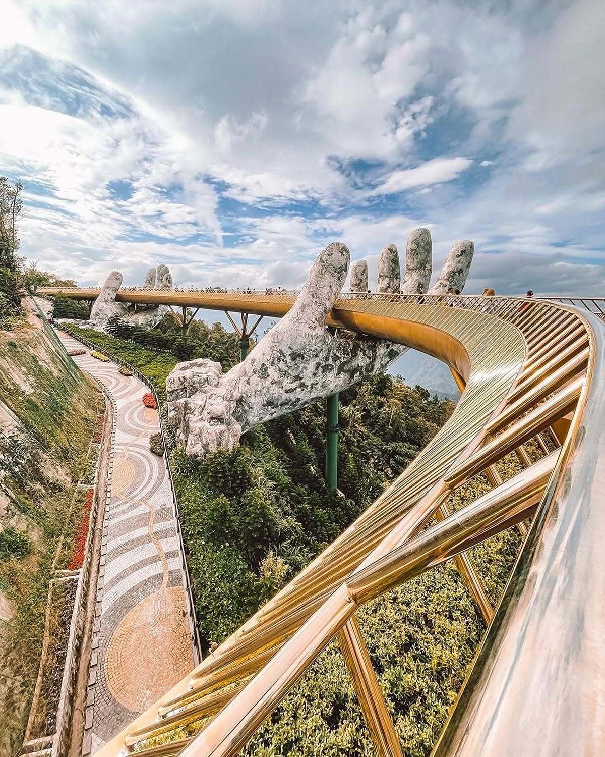 Vietnam'ın Da Nang kenti yakınlarındaki Bà Nà Hills tatil köyünde yer alan Altın Köprü, 150 metre uzunluğunda bir yaya köprüsü olarak, hem estetik hem de mühendislik açısından büyüleyici bir yapı. 2018 yılında açılan bu eşsiz köprü, dev ellerin köprüyü taşıyor gibi görünmesiyle adeta bir sanat eseri. TA Landscape Architecture tarafından tasarlanan yapı, doğanın ve insan elinin mükemmel bir buluşması olarak dikkatleri üzerine çekiyor.