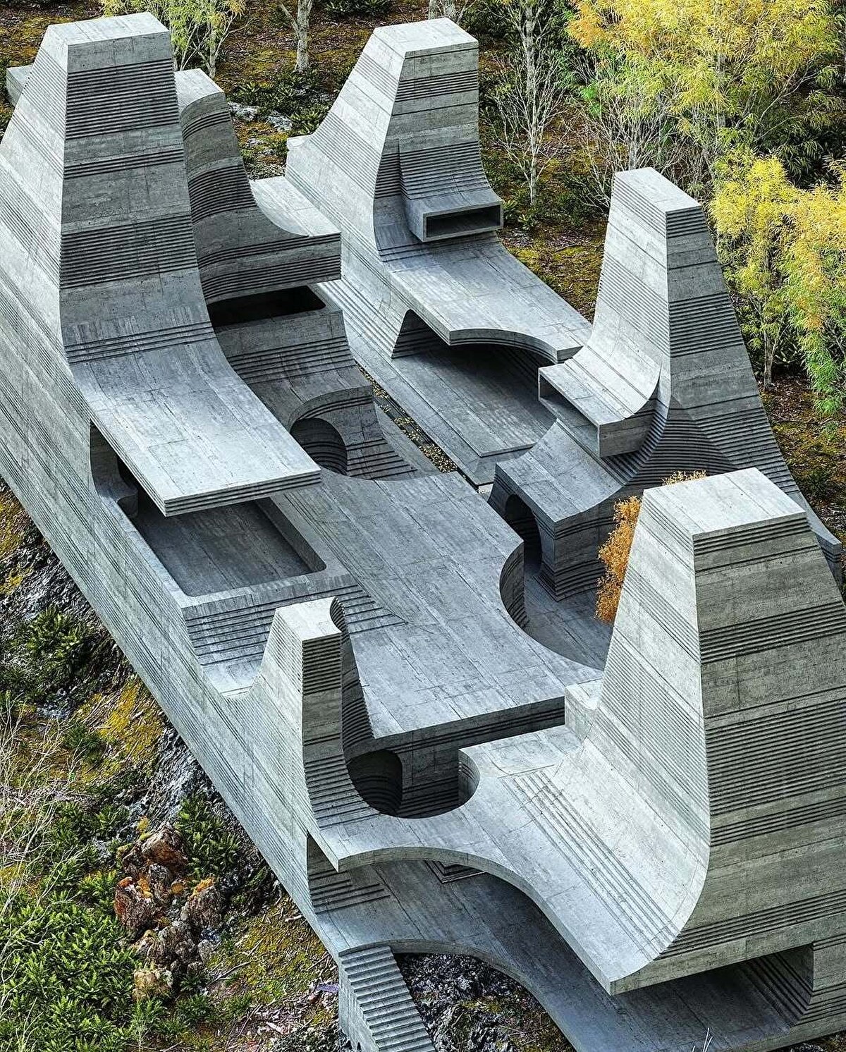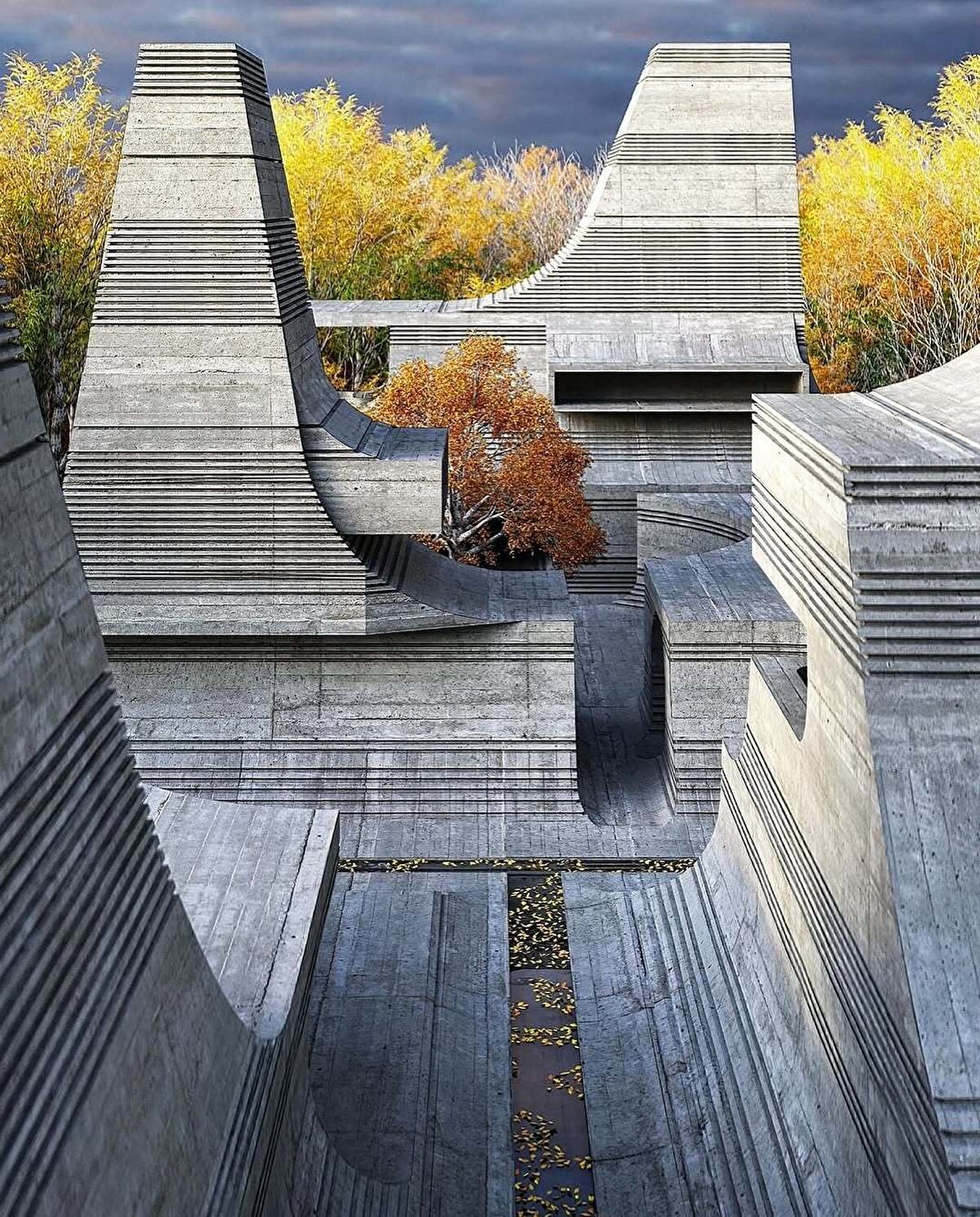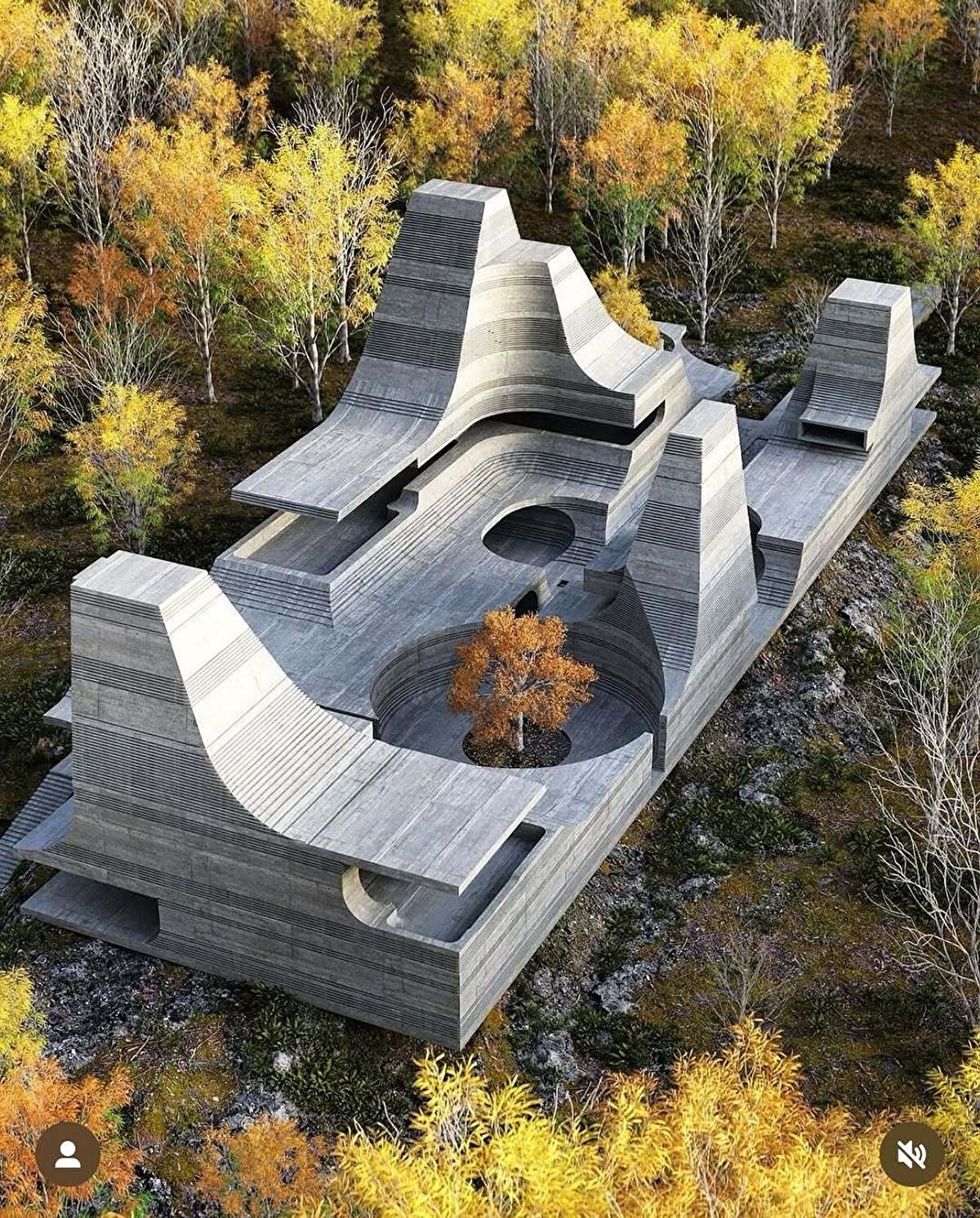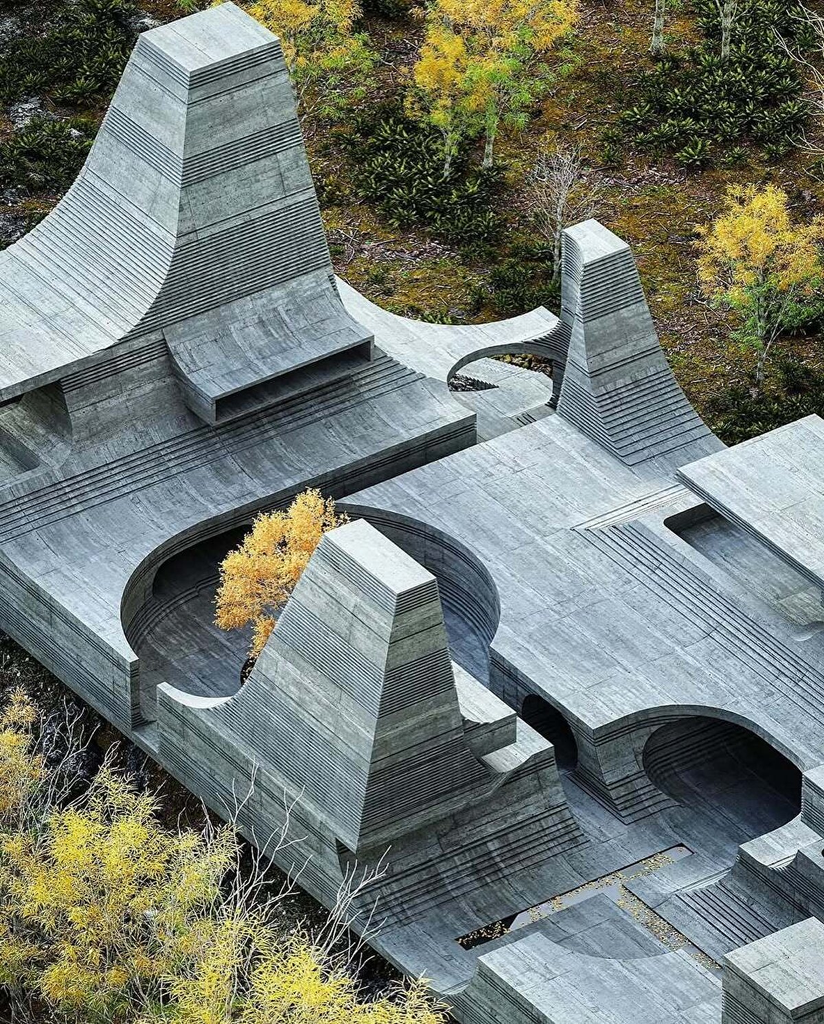 Hindistan'da bulunan bu yapı, tasarımcısı Mimar Amey Kandalgaonkar'ın yıllar önce ziyaret ettiği tapınağı hayal ederek tasarladığı mimari bir eser. Gözlemlediği hint tapınağını brütalist mimari tarzda yeniden tasarlayan @ameyzing_architect, tapınak içinde yer alan bölümlerin samimiyetini çağdaş bir görünümle yansıtmak için farklı bir formda inşa ederek hem geleneksel tapınak görünümünden sıyrılmış hem de modern bir izlenim bırakan bi çalışmaya imza atmış. Aynı forma sahip ama birbirlerinden farklı yönlere doğru konumlanmış şekil verilmiş beton parçaları aynı zamanda modern bir kayak pistine de benziyor.